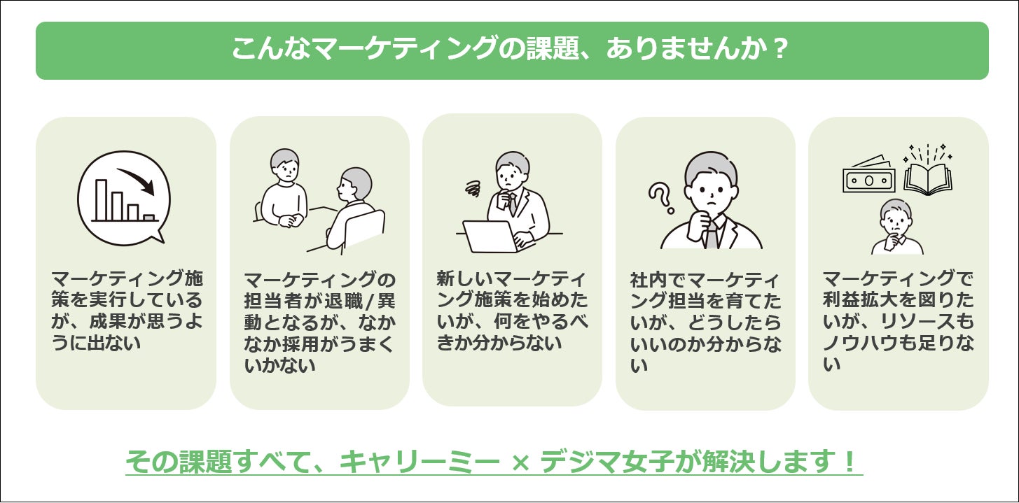 「キャリーミー」のマーケティング領域におけるプロ人材がマーケティング戦略を立案し、デジタルマーケティング業務を伴走支援する「デジマ女子」が企業に常駐して施策を実行することで、企業のマーケティング活動を支援いたします。