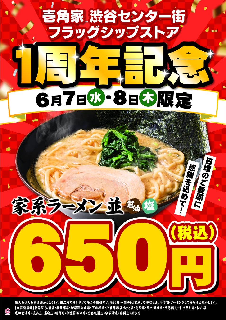 横浜家系ラーメン壱角家 渋谷ガーデンビルオープン1周年記念キャンペーン2日間限定で『家系ラーメン並』を税込650円で提供