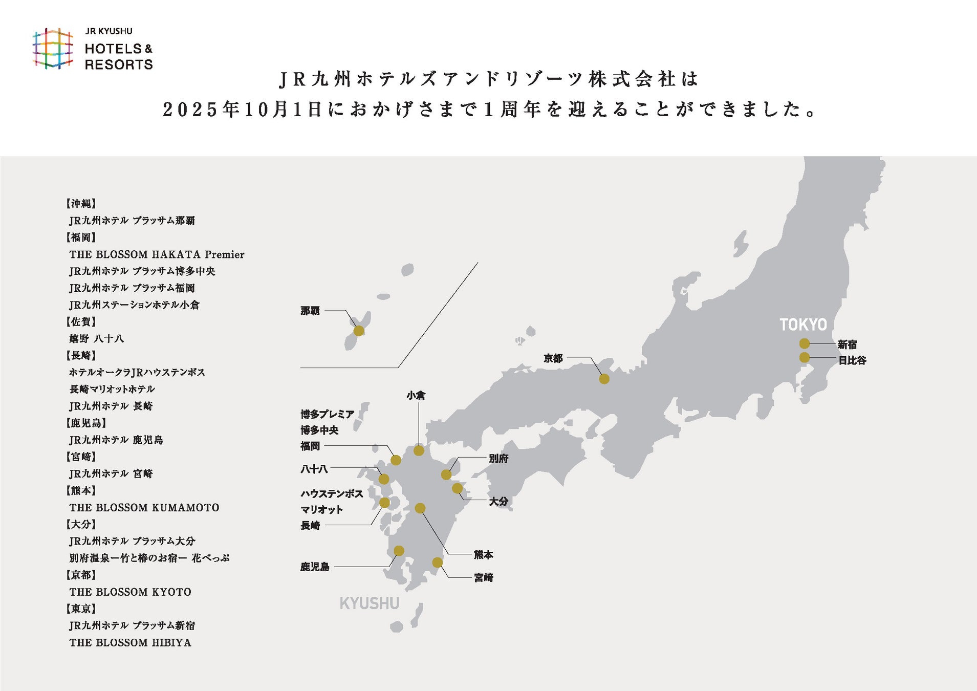 JR九州グループのホテル運営会社4社が合併し、2024年10月に「JR九州ホテルズアンドリゾーツ株式会社」が誕生しました。九州各地・東京・京都・沖縄の駅近くや観光地付近の好立地に、都市型リミテッドサービスホテルから宴会・ウェディングを備えたフルサービスホテル、温泉リゾートなど、多種多様な17のホテル・旅館を運営しています。「ひとりひとりが持つホスピタリティの心で、ホテルから幸せの輪を世の中に広げていきます」をパーパスに掲げ、お客さまに快適で上質な滞在体験を提供してまいります。