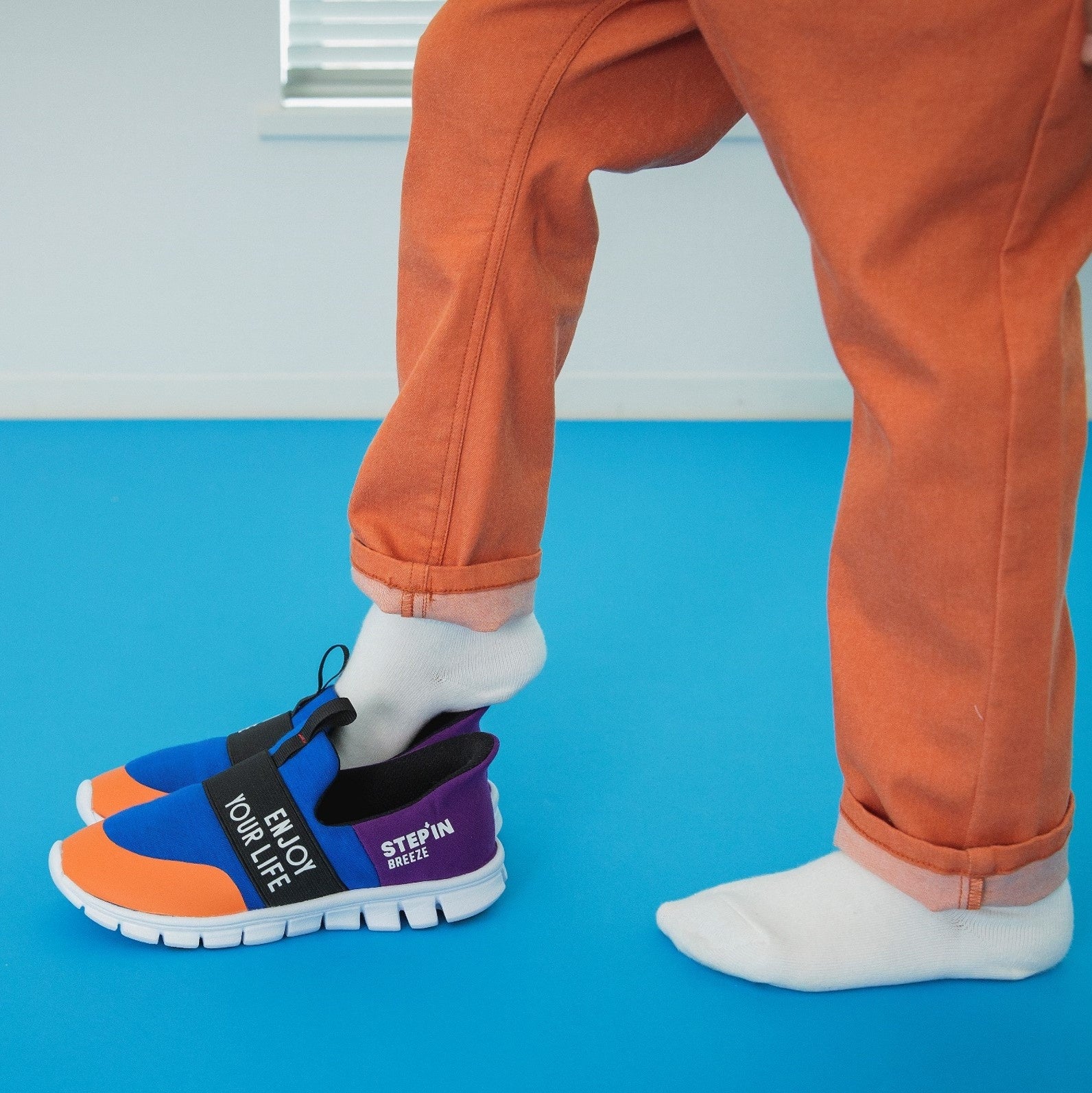 BREEZE のステッピンシリーズは、『踏んでも簡単に潰れない特殊な芯材』と『⾜⼊れし易い独⾃の曲線形状』により、⼿を使うことなく⽴ったまま⾜を踏み⼊れるだけで着用することができます。
