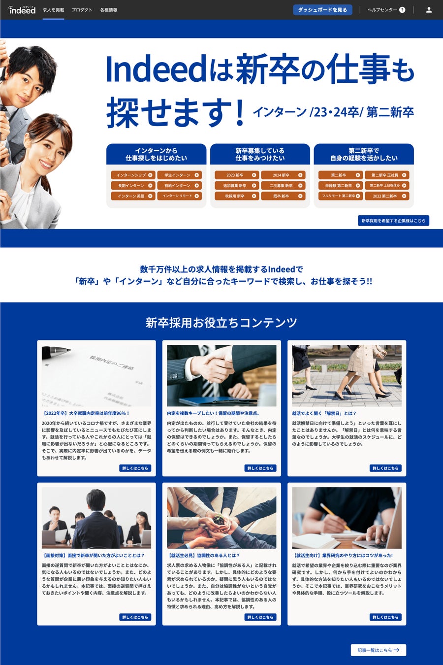 本Webページを活用いただくことで、初めての就職活動となることが多い学生や既卒のみなさまを、より多角的にサポートしていきたいと考えています。Indeedは今後もさまざまな形で、全て人々が自分にあった仕事につけるような社会の実現を目指し、仕事探しのサポートを続けて参ります。