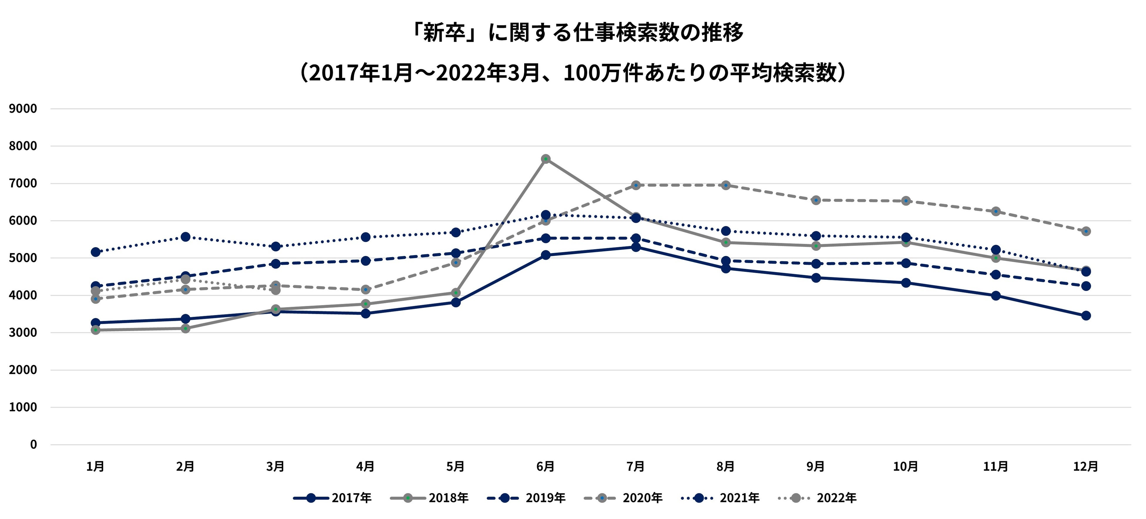 「新卒」を含む検索数は、年によって差があるものの、例年、5月頃から検索数が増加し始め、8月以降は減少する傾向があることがわかりました。各年の検索数のピークは、2017年・2019年・2020年は7月、2018年・2021年は6月となっています。夏前から仕事を探す人・探す頻度が増え始め、夏頃にピークを迎える傾向にあるといえそうです。