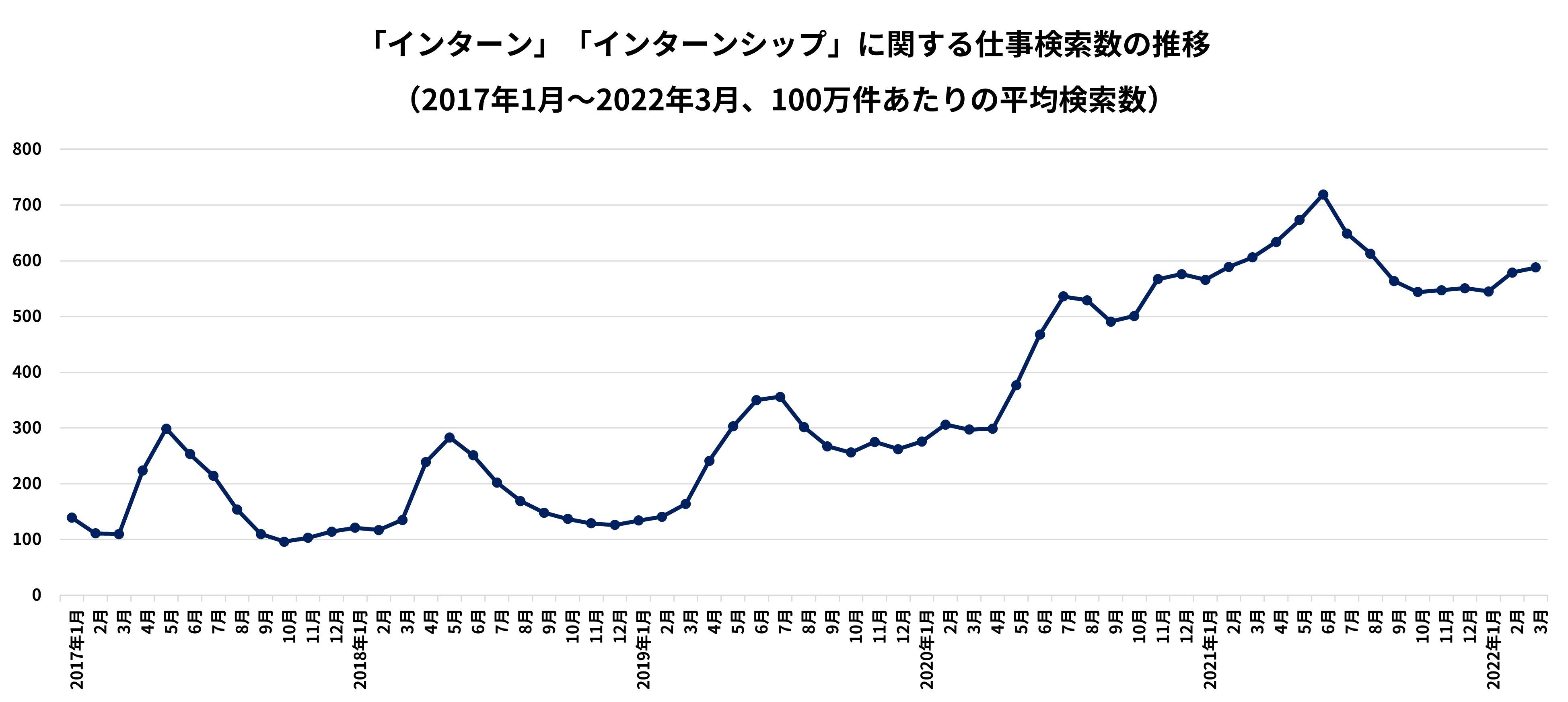 一方で、Indeedを新卒募集の求人を探すための”初めての就職活動”に活用いただいている方や、第二新卒に関連した仕事探しに活用いただいている方も多く、Indeedのデータから「新卒」で仕事検索が行われている状況を確認すると、例年、似たような月ごとのトレンドが見つかりました。また、インターンシップに関連した仕事検索数は増加しており、特に2019年に急増していたことがわかりました。