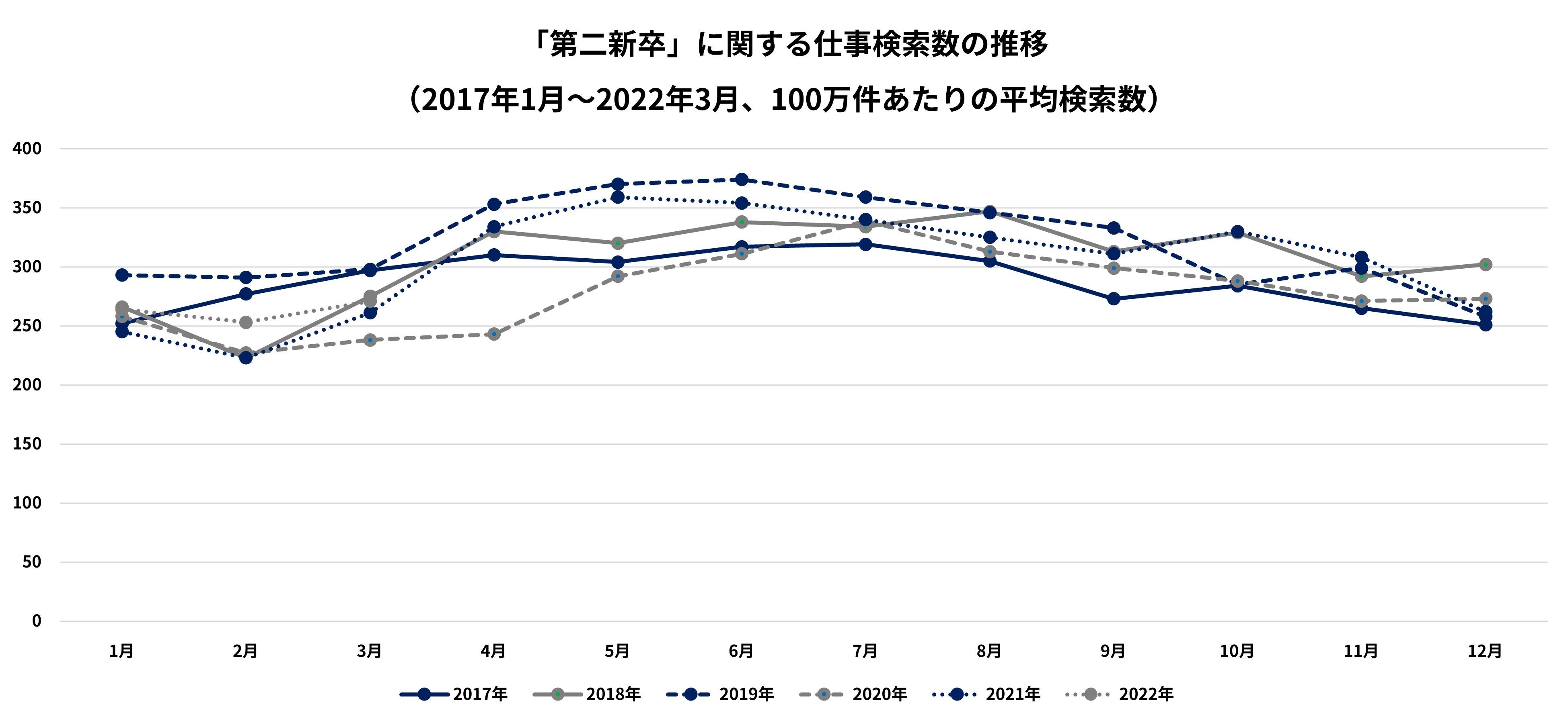 「第二新卒」を含む検索数は、年によって差があるものの、おおむね、2月頃から検索数が増加し始める傾向にありました。各年の検索数のピークは、2017年・2020年は7月、2018年・2019年は6月、2021年は5月となっており、「新卒」関連の検索と同様の傾向を示しましたが、「新卒」関連の検索よりも早い時期に検索数が高まる傾向にあります。