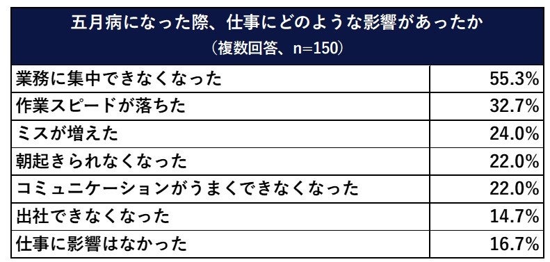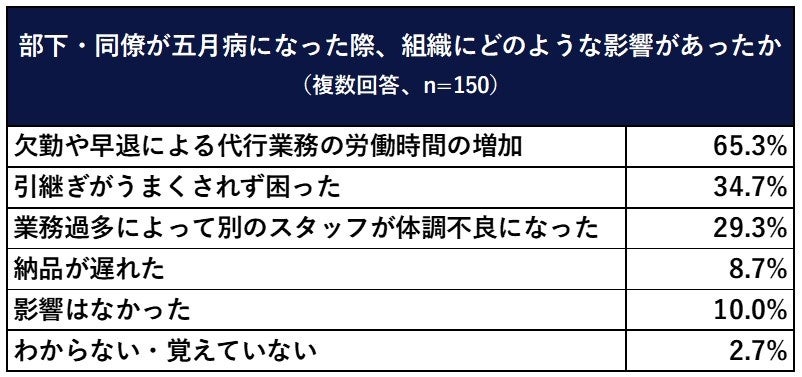 また、同僚や部下が五月病になった際の影響も少なくなく、「欠勤や早退による代行業務の労働時間の増加」が65.3%、「引継ぎがうまくされず困った」が34.7%、「業務過多によって別のスタッフが体調不良になった」が29.3%という結果が出ました。