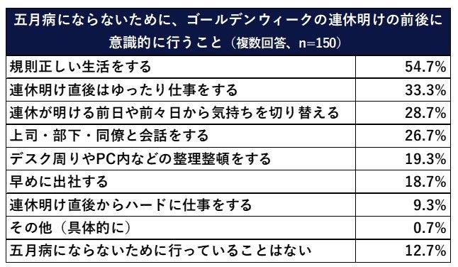 Q10. あなたが五月病にならないために、ゴールデンウィークの連休明けの前後に意識的に行うことをお答えください。(複数回答、n=150)
