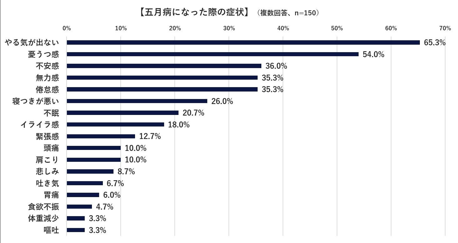 五月病になった際、どのような症状があったか聞いたところ、「やる気が出ない」が65.3%と最も多い回答でした。次いで「憂うつ感」54.0%、「不安感」36.0%、「無力感」と「倦怠感」が35.3%で、上位5位は全て精神的な症状でした。