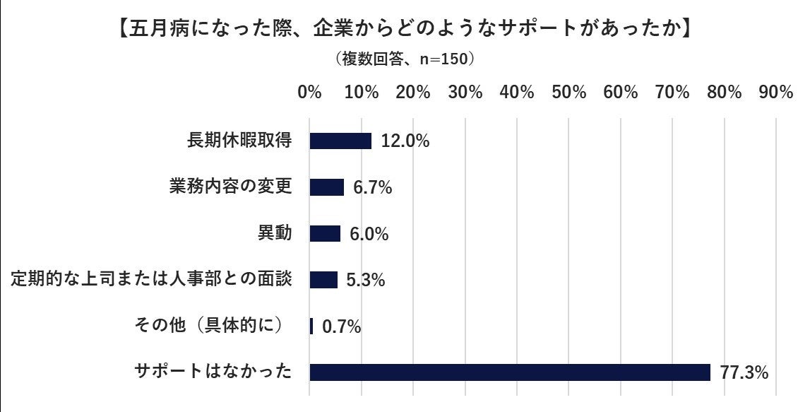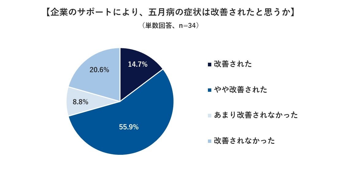 Q6. 五月病になった際、企業からどのようなサポートがあったかお答えください。(複数回答、n=150 ※ご自身が五月病になった方)また、企業のサポートにより、五月病の症状は改善されたと思いますか。(単数回答、n=34 ※ご自身が五月病になった方)