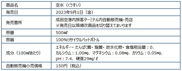 「空水」は、成田空港が開港30周年を迎えた2008年5月の発売以来、成田空港をご利用される多くのお客様に飲用いただいています。発売から15年が経過し、これからも末永く愛され続ける成田空港を代表するプライベートブランド商品でありたい思いから、ラベルとキャップは新たに自然由来の天然水らしさと成田空港らしさをデザインに取り入れ、容器は環境へ配慮した100%リサイクルペットボトルへと切り替えてリニューアル発売します。