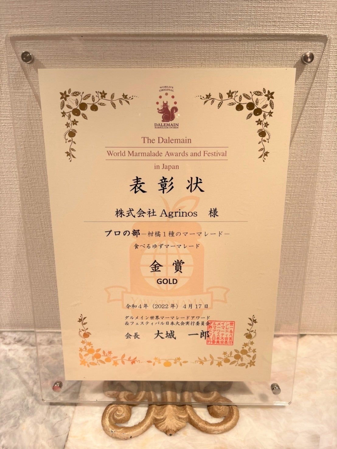 ―第4回ダルメイン世界マーマレードアワード&フェスティバル日本大会にて「そのまま食べるゆずマーマレード」がプロの部で金賞を受賞しました。-