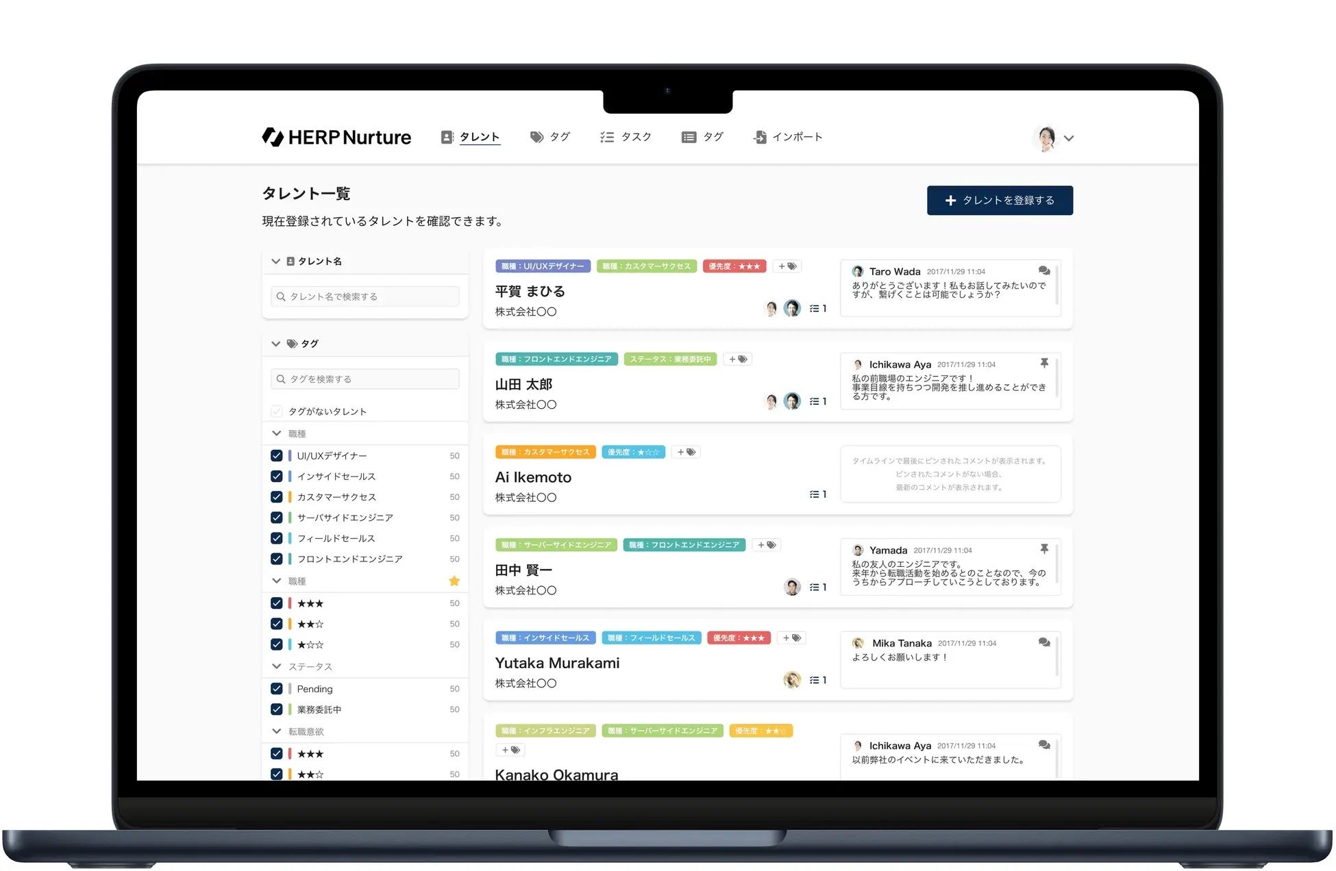 『HERP Nurture』はタレントの選考意欲およびアプローチを可視化し、最適なコミュニケーションを実現するスクラム採用向けタレント管理プラットフォームです。企業の採用活動における潜在的な候補人材すなわちタレントの情報を、企業が一元管理/活用できるようデータベース化し、自社にとっての中長期での採用資産を形成します。