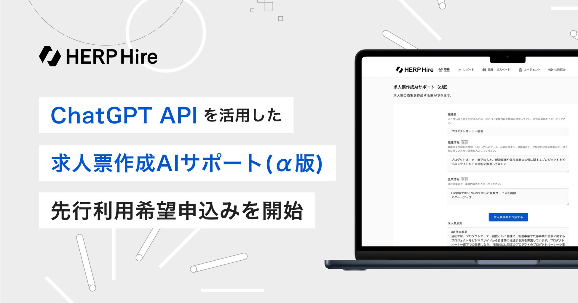 【HERP Hire】ChatGPT APIを活用した「求人票作成AIサポート(α版)」の先行利用希望申込みを開始