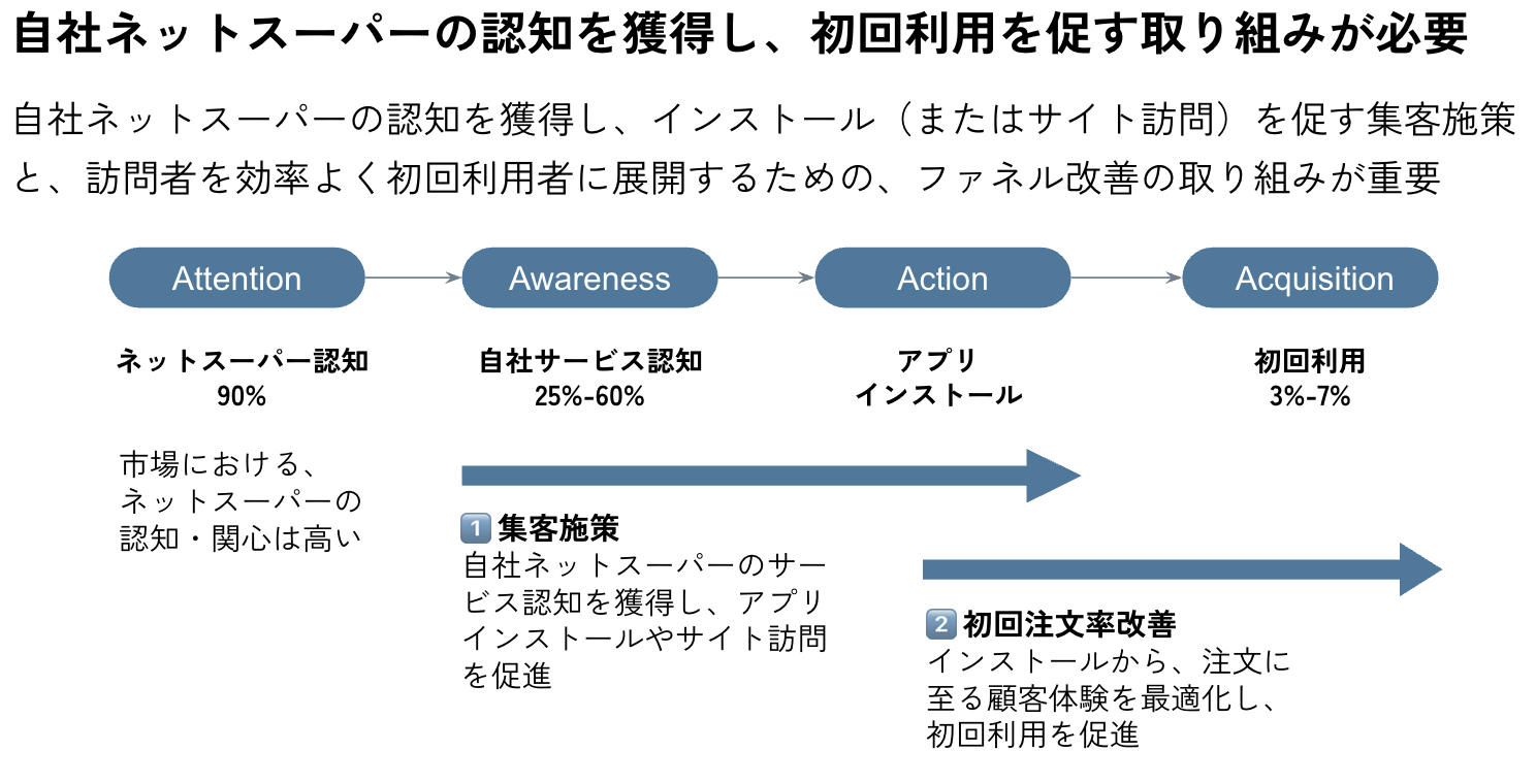 インストールを促す集客施策と、訪問者を効率よく初回利用者に展開するためのファネル改善の取り組みや、集客施策の優先順位について事例とともに紹介。バスケットスターター商品の特売や、配達枠選択の改善ついて重点的に説明しています。