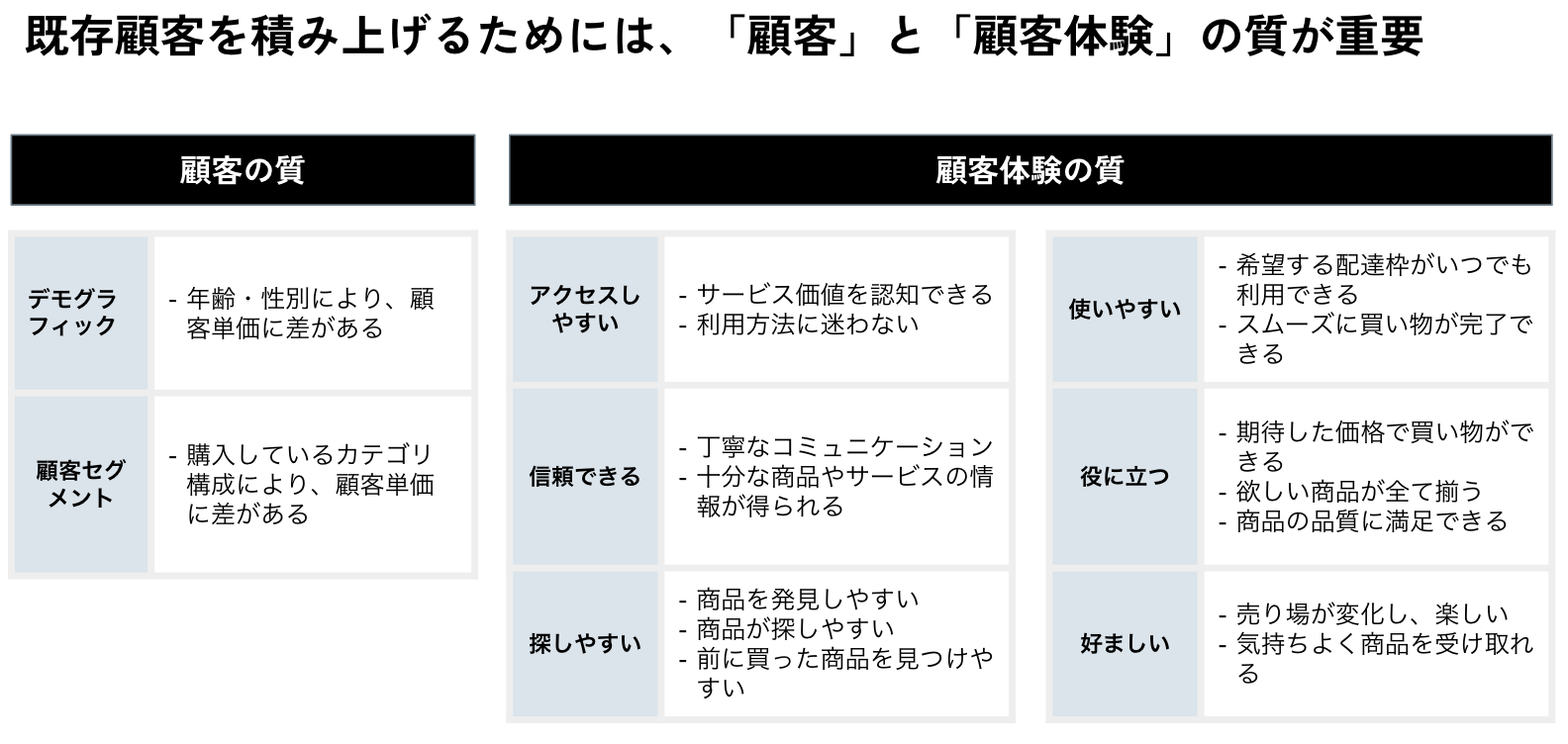 既存顧客の継続率が売り上げ成長の鍵になることは間違いありません。スーパーの事業は既存顧客のリピート率は高く、継続した売上が見込めるのが特徴ですが、顧客単価をあげることも重要です。そこで、「顧客単価の増加率 vs 注文顧客数の減少率」について、US食品宅配「Instacart」の事例などを紹介。また、既存顧客を積み上げるための原則として、「顧客の質」と「顧客体験の質」についても講じています。