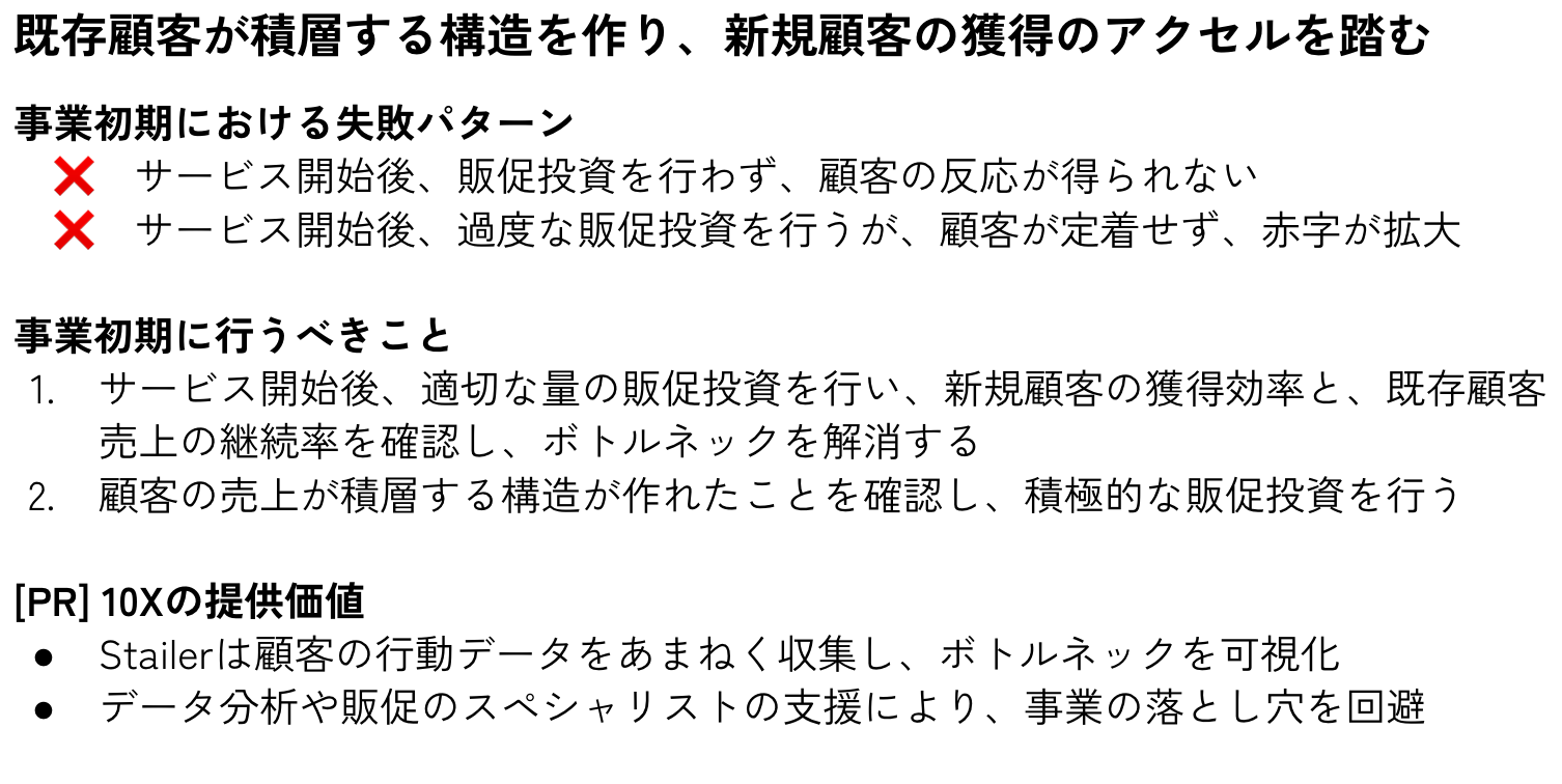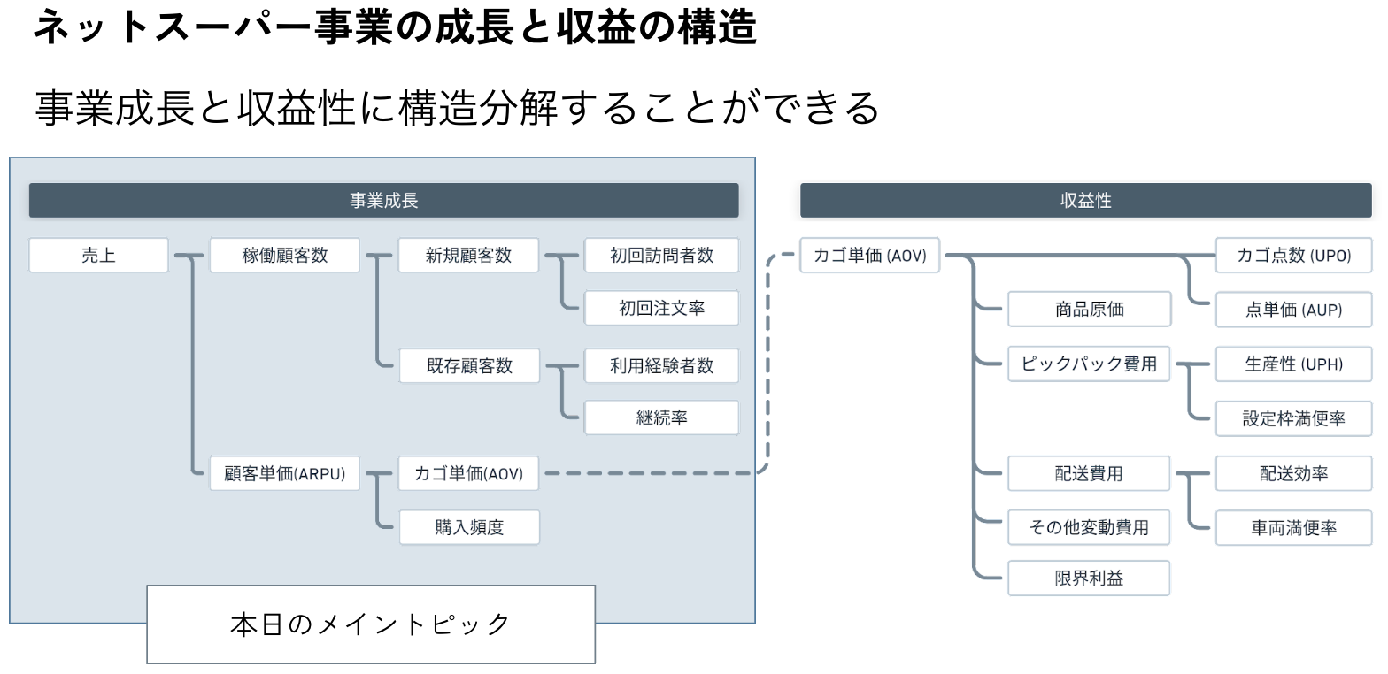 ネットスーパー事業は、「事業成長」と「収益性」に構造分解することができます。本セミナーでは「事業成長」にフォーカス。売上成長を「新規顧客の獲得」と「既存顧客の維持」に、さらに事業ステージを「事業初期」「成長期」「成熟期」に分解し、事業初期に実施すべきことについて説明しています。