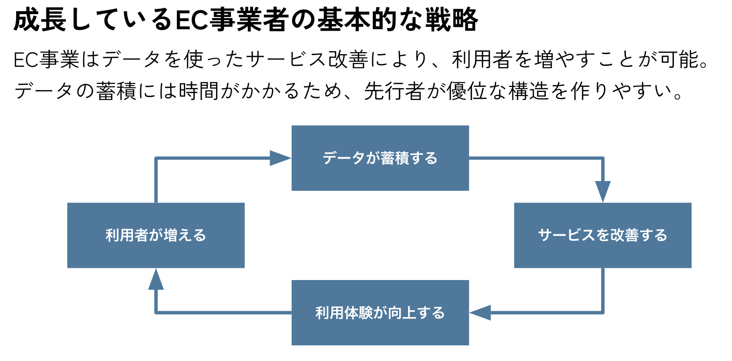 成長しているEC事業者の基本的な戦略として、データ活用の重要さについて解説しました。EC事業はデータを使ったサービス改善により、利用者を増やすことが可能ですが、データの蓄積には時間がかかるため、先行者が優位な構造を作りやすくなっており、いかにデータを蓄積していくかが鍵となります。