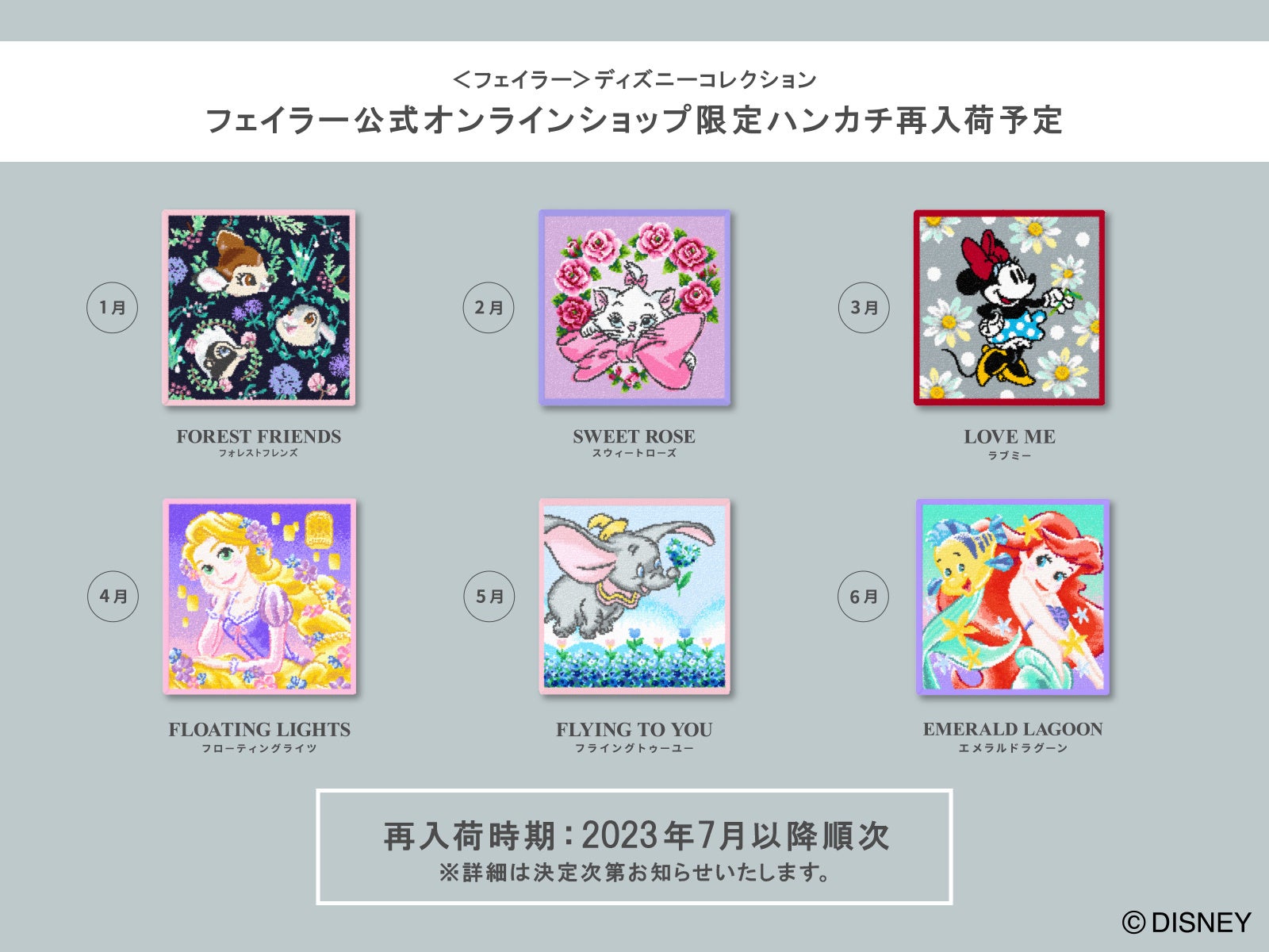 1月発売『フォレストフレンズ』、2月発売『スウィートローズ』、3月『ラブミー』、4月『フローティングライツ』、5月『フライングトゥーユ―』、6月『エメラルドラグーン』のフェイラー公式オンラインショップ限定ハンカチにつきまして、追加生産を決定し、2023年7月以降~年内に再入荷を予定いたしております。早期再入荷実現のため、生産商品を絞り、店舗限定ハンカチの再入荷はございません。