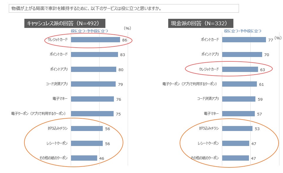 ・約9割が物価上昇を実感しており、物価上昇局面において「ポイントカード」や「クレジットカード」「ポイントアプリ」が人気である一方、折り込みチラシやレシートクーポンなど紙のサービスはキャッシュレス派、現金派ともに低評価