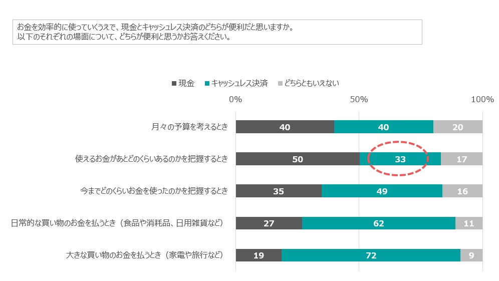 ・「使えるお金を把握するとき」は半数が現金が便利と回答し、支払う局面ではキャッシュレス決済が便利だが、「どの位使って良いか」といった予算管理には現金が好まれる傾向