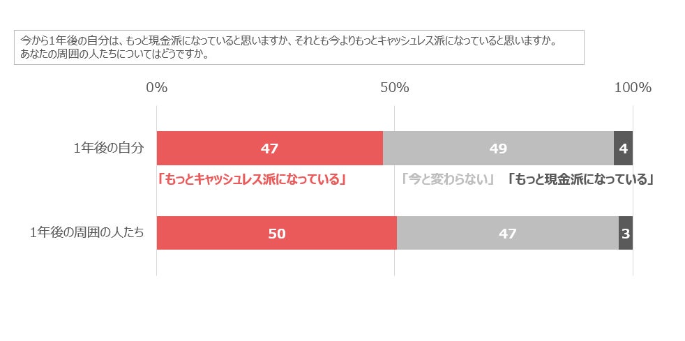 ■「1年後の周囲の人たちはもっとキャッシュレス派になっている」と回答したのは半数