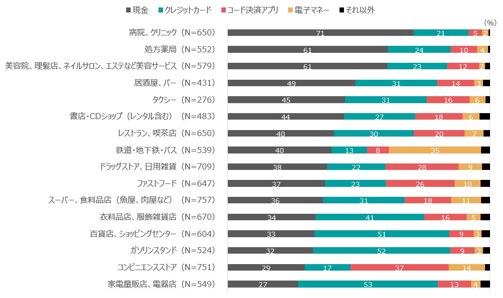 ・ 各業種で利用する決済手段では、医療分野ではキャッシュレス化の遅れが目立つものの、1年前との比較ではすべての業種でQRコード決済アプリの利用率が増加