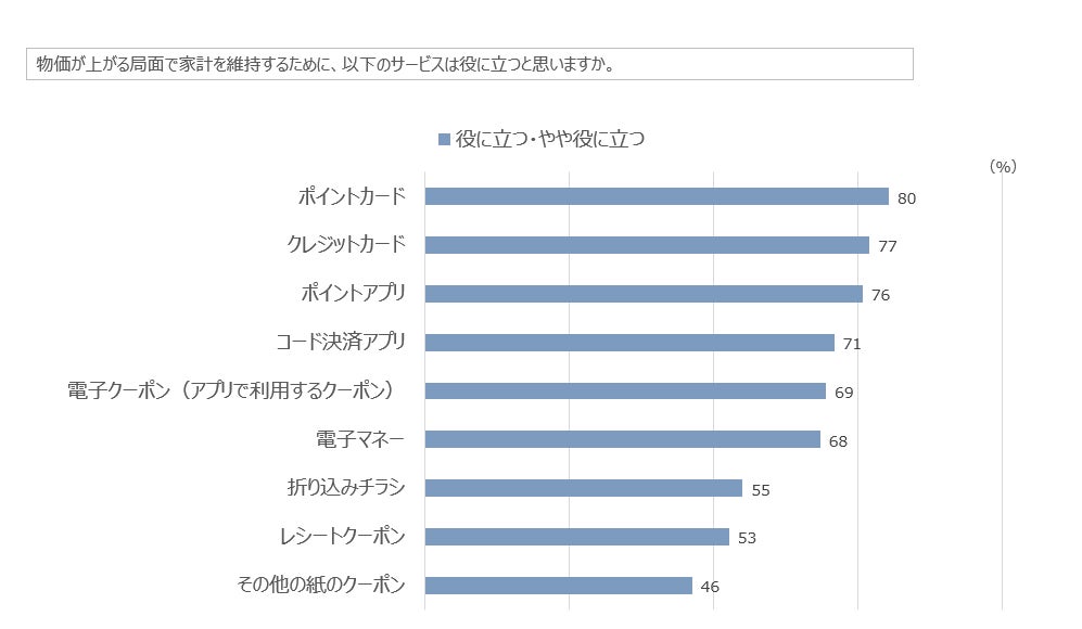 ■物価上昇局面で役に立つサービスとして「ポイントカード」や「クレジットカード」「ポイントアプリ」が人気