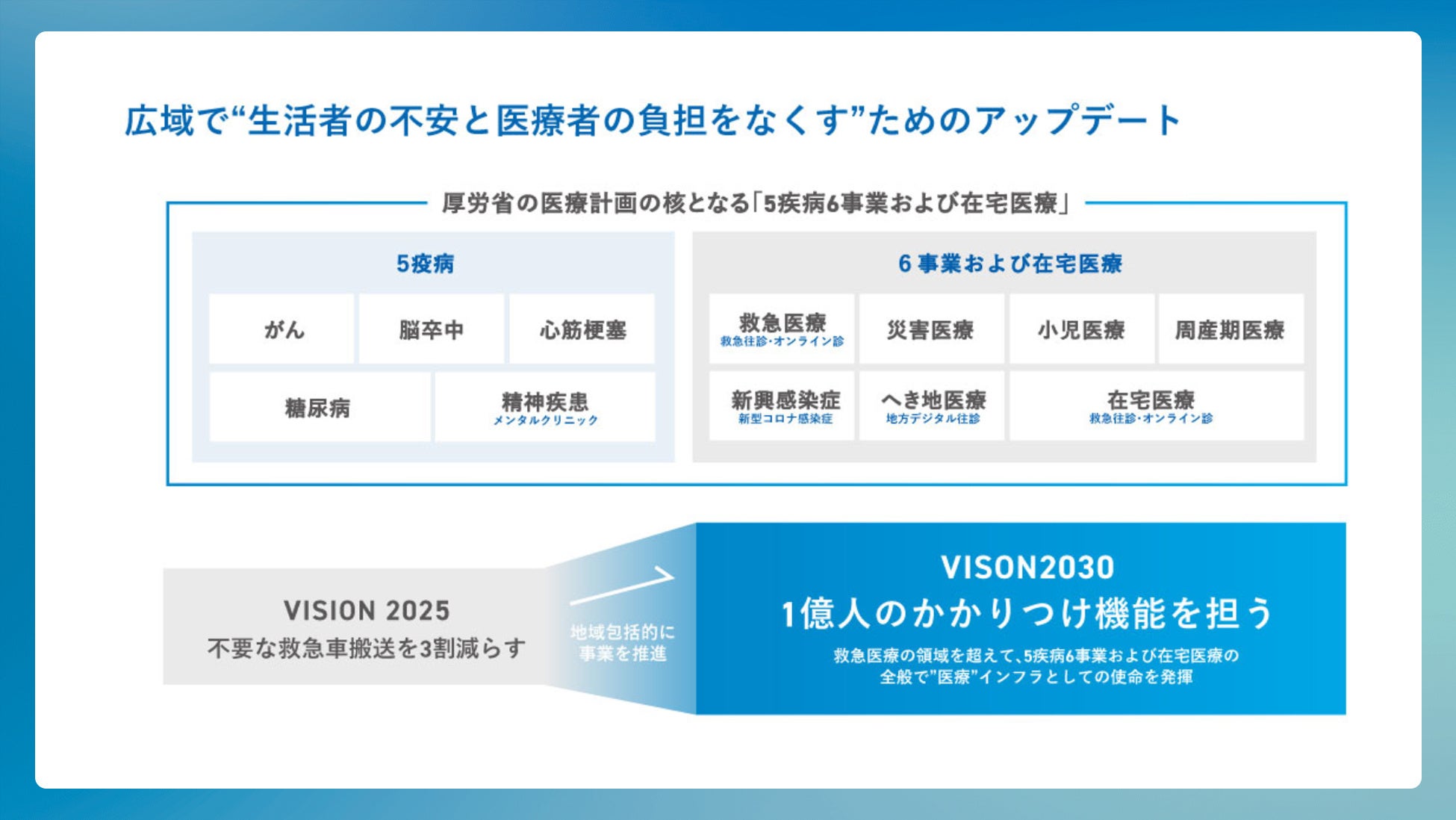 加えて今後、さらなる医療の質的向上を追求するにあたり、これまでファストドクターが重点的に取り組んでいた「救急医療支援」に加え、ヘルスケアデータを活用した「慢性期医療支援」や、テクノロジーによって物理的距離を超えた「へき地医療支援」など広域でのソリューションを展開し、地域医療に貢献してまいります。