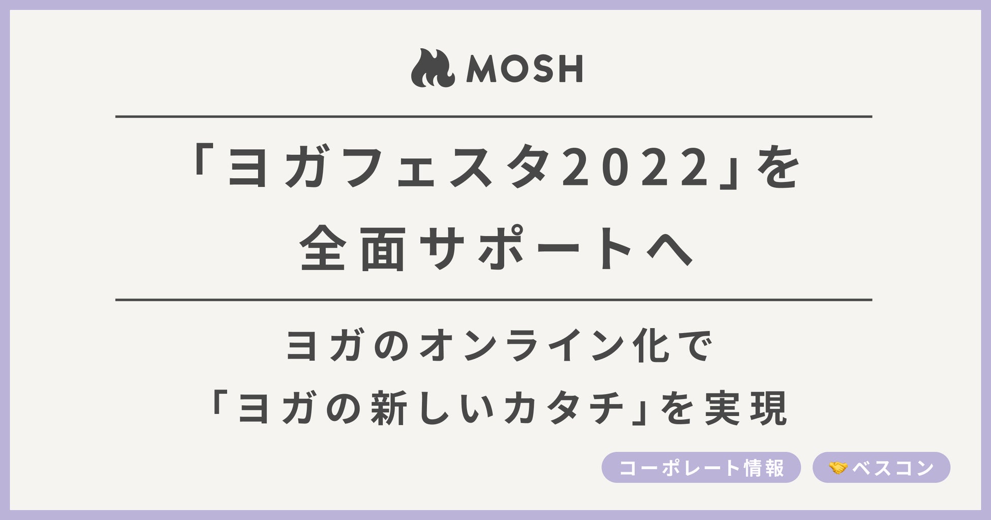 この度、「ヨガフェスタ」が今年から対面とオンラインの両方で同時開催されることから、「ヨガフェスタ2022」のメイン会場と、サテライト会場である「ヨガフェスタ2022 in沖縄」、そして全ヨガクラスオンラインで実施される「YOGAweek」の3会場で、MOSHのシステム・機能をオンラインヨガクラスやイベント予約にご活用いただき、ヨガフェスタの目指す「新しいヨガのカタチ」であるヨガのオンライン化を全社を挙げて支援することといたしました。
