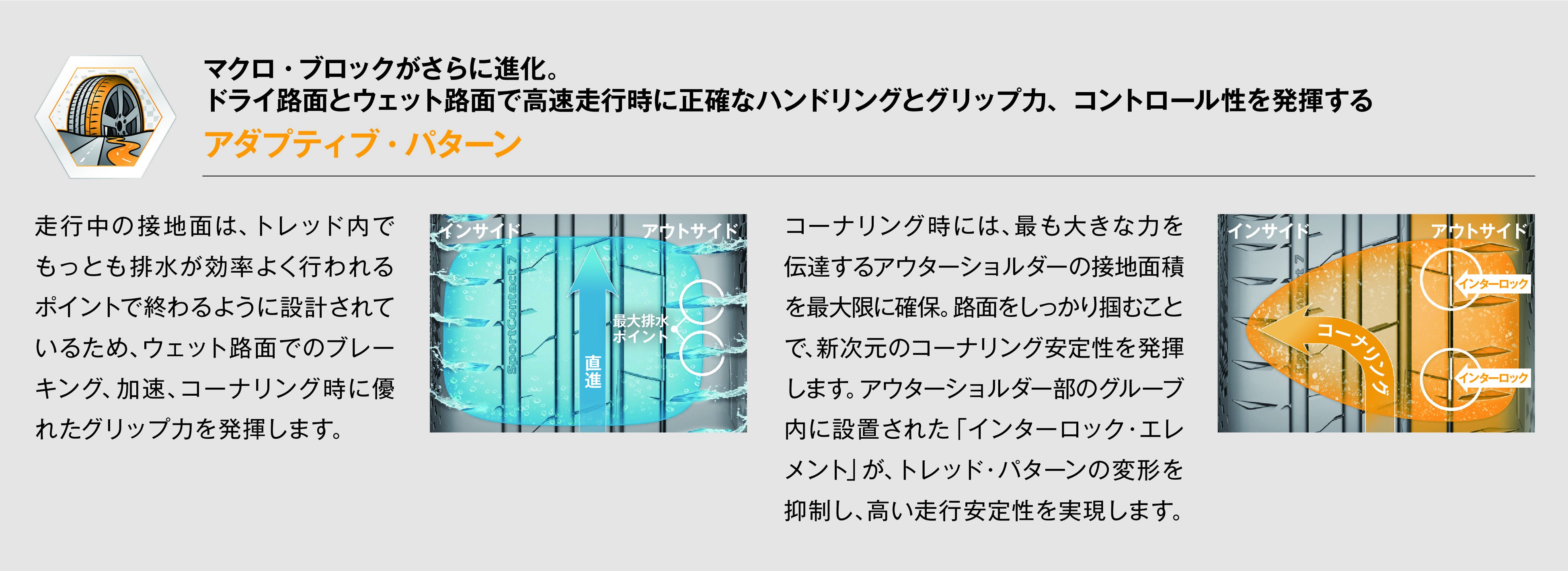 1.ドライ路面とウェット路面での高速走行時に正確なハンドリングとグリップ力、コントロール性を発揮する『アダプティブ・パターン』