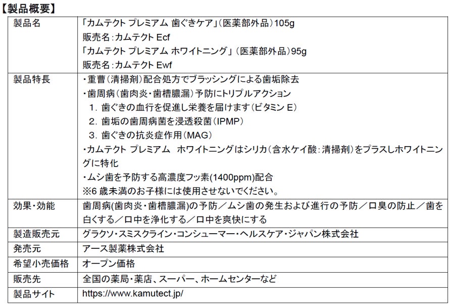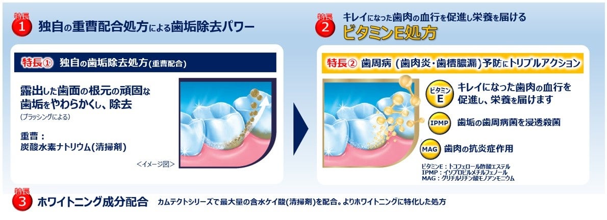 「カムテクト プレミアム」は、「カムテクト」シリーズ独自の重曹配合処方による歯垢除去パワーと、殺菌・抗炎症作用による歯肉炎・歯槽膿漏予防の効果に加え、日本だけのオリジナル処方である「ビタミンE」を新たに配合しました。歯垢除去後、キレイになった歯ぐきの血行を促進し、歯周組織に栄養を届けて歯周病を予防します。「カムテクト プレミアム 歯ぐきケア」は、歯ぐきの健康ケア(歯周病予防)に特化したタイプ、「カムテクト プレミアム ホワイトニング」は、歯周病予防に加え、シリカ(含水ケイ酸:清掃剤)配合でホワイトニングに特化したタイプとなっています。