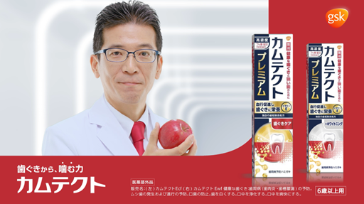 カムテクトの研究に深く携わっている研究員・陶山和明氏が、新しい「カムテクト プレミアム」の特長である、独自の重曹配合処方による歯垢除去パワーと、新たに配合された歯周病予防成分「ビタミンE」が歯ぐきの血行を促進し、栄養を届けるメカニズムをイメージ動画でわかりやすく説明します。最後に新しいブランドコピーである「歯ぐきから、噛む力 カムテクト」をりんごを噛むシーンとともに「カリッ」というインパクトのある効果音で伝えます。