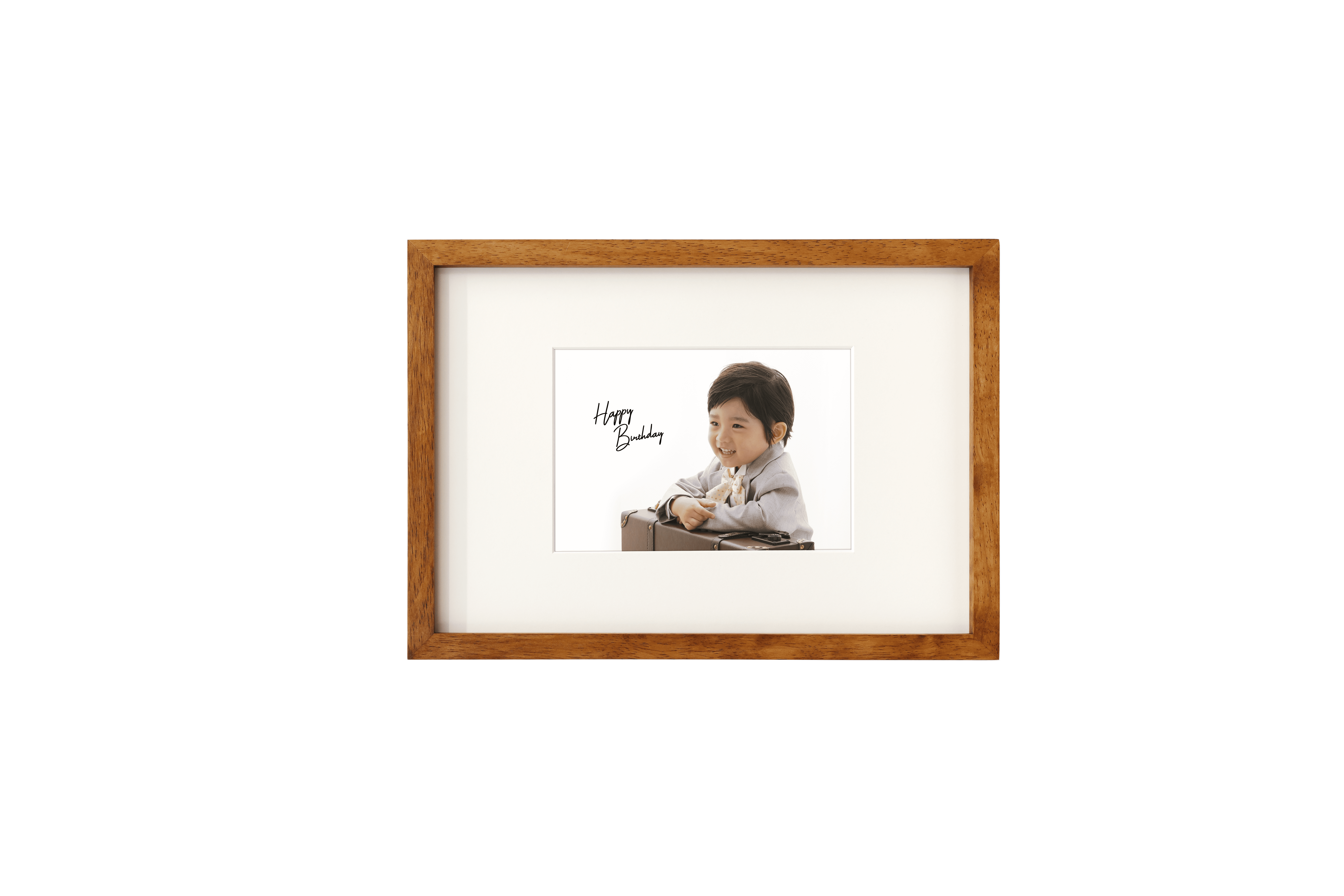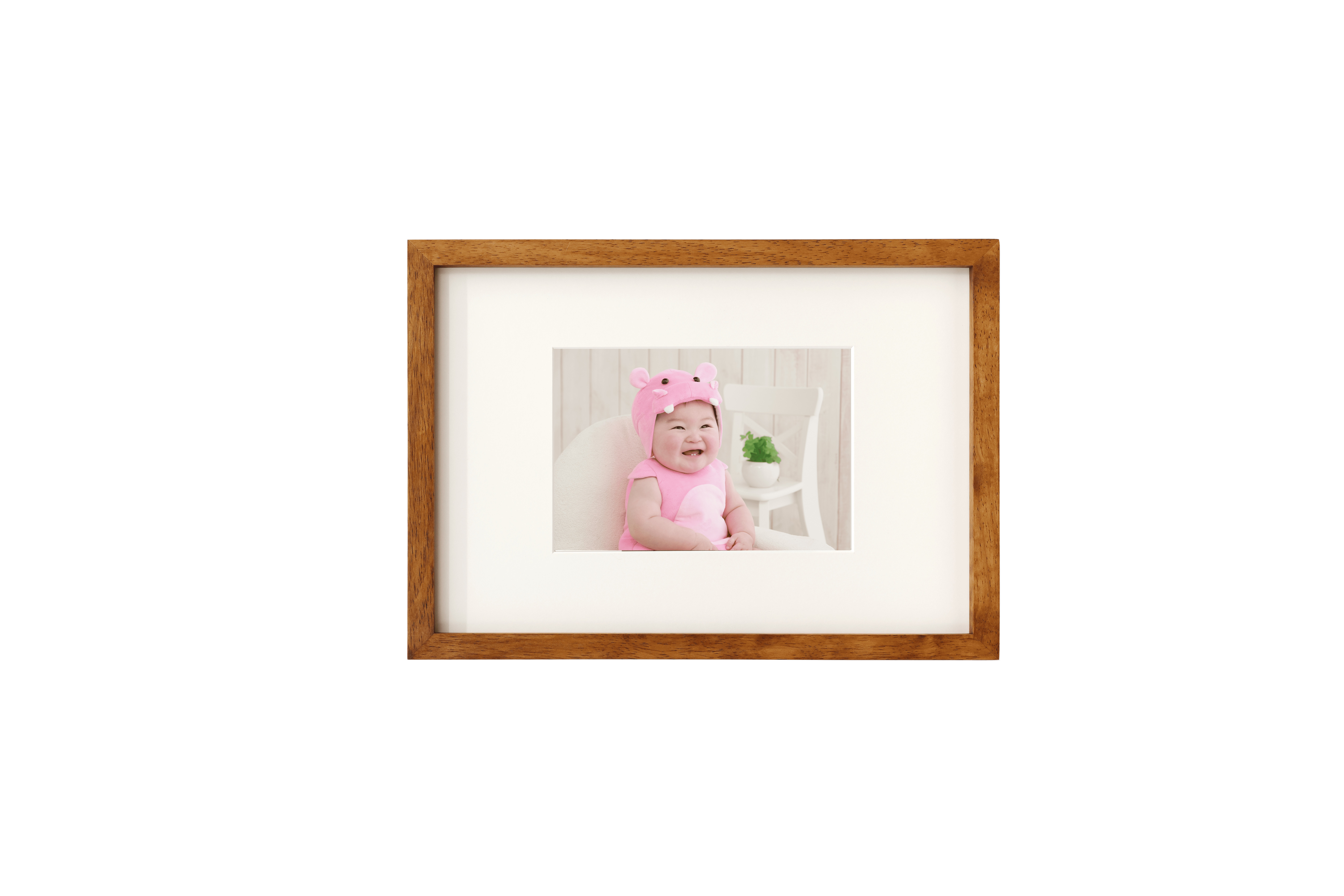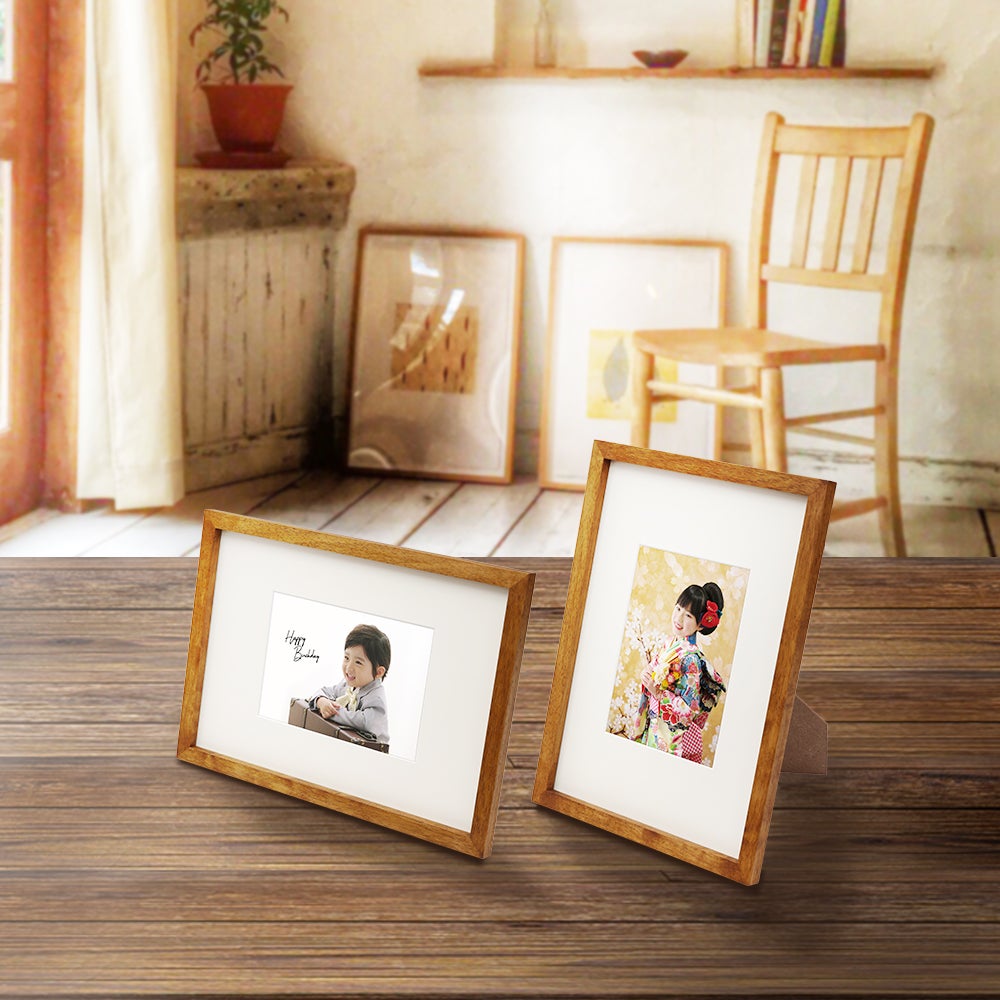 地球環境に配慮したサステナブルな「エコラフレーム」は、シンプルでスタイリッシュなデザインです。飾る際にご自宅の壁に負担が少ないよう軽量設計で開発し、重さはわずか394グラム。特に表面はガラスではなく、クリアなペット素材を採用しており、地震などで落下してもガラスが飛び散ることなく軽さと安全性を活かした安心な設計です。デザインについては大胆な中窓で写真を引き立てるよう、あえて広めの中窓に写真をセットできるように設計し、よりお子さまの表情や背景が際立つデザインにしました。