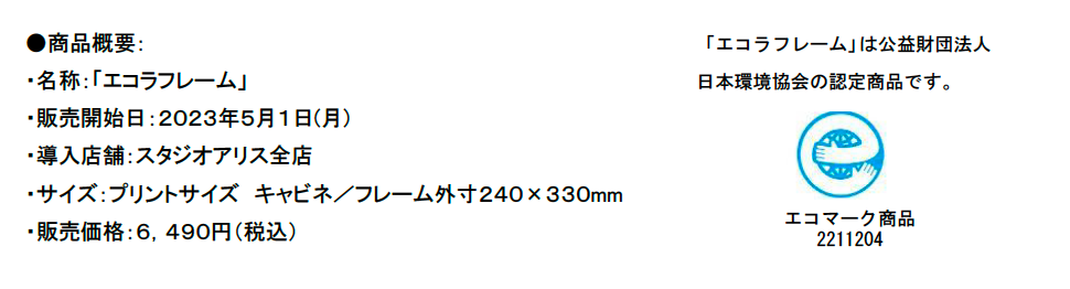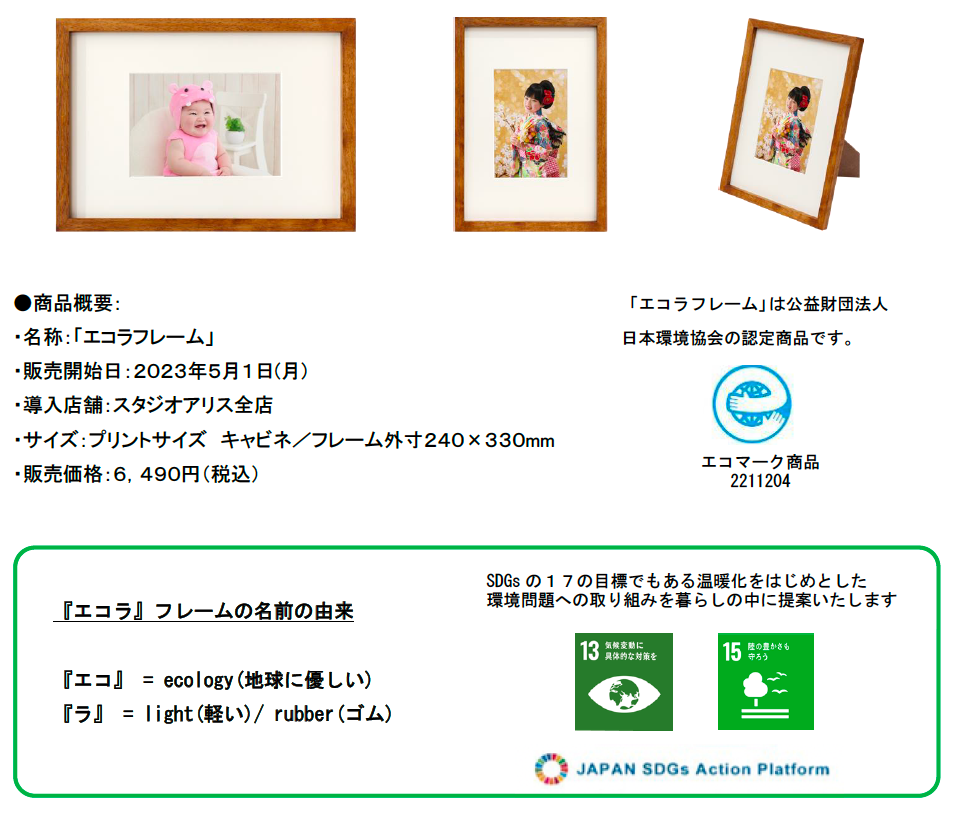 株式会社スタジオアリス(本社:大阪府大阪市、代表取締役社長:牧野俊介)は、持続可能な社会の実現に向けSDGs事業の一環として、これまで廃棄衣装のリサイクルなど、こどもたちが豊かな未来を迎えられるよう取り組みを進めてまいりましたが、このたび新たな取り組みとして、地球環境に配慮した木材「ラバーウッド」を使用した新フォトフレーム「エコラフレーム」を開発いたしました。ゴムの樹液を持続的に採取し、その後の木材も持続的に再利用するというサステナブルな取り組みから生まれた「エコラフレーム」。10年後、20年後、50年後も美しい地球環境の中、こどもたちが平和で豊かな社会で暮らせることを願い、このたび商品化が実現いたしました。世界で注目されるラバーウッドを使用した地球環境にやさしいフォトフレーム「エコラフレーム」は、スタジオアリス全店舗に導入し、2023年5月1日より販売を開始いたします。