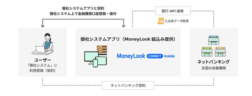 「MoneyLook CONNECT」は会計システムや入金管理システムなど、入出金情報を連携させたい業務アプリを開発販売する企業向けに提供するサービスです。「MoneyLook」機能との連携によりシステムを利用するユーザーの利便性向上に寄与します。