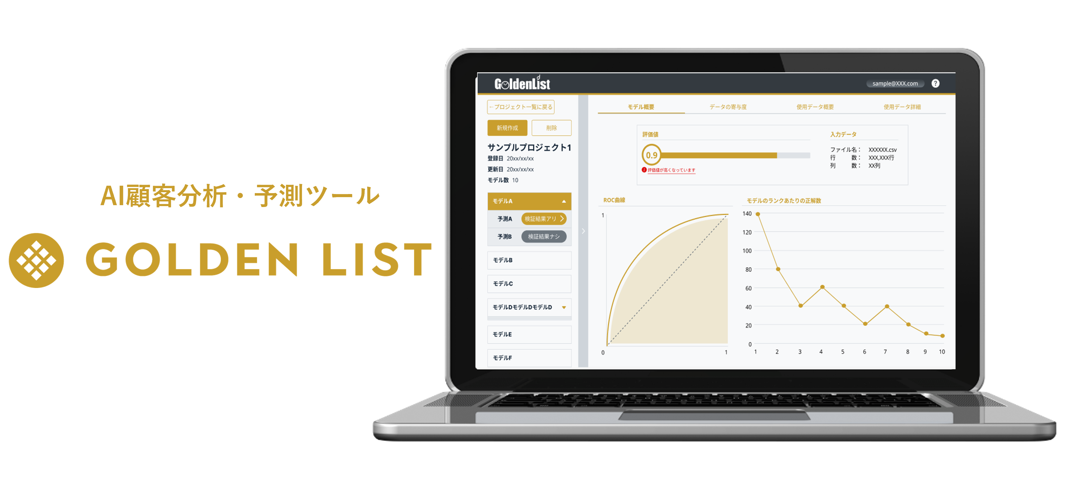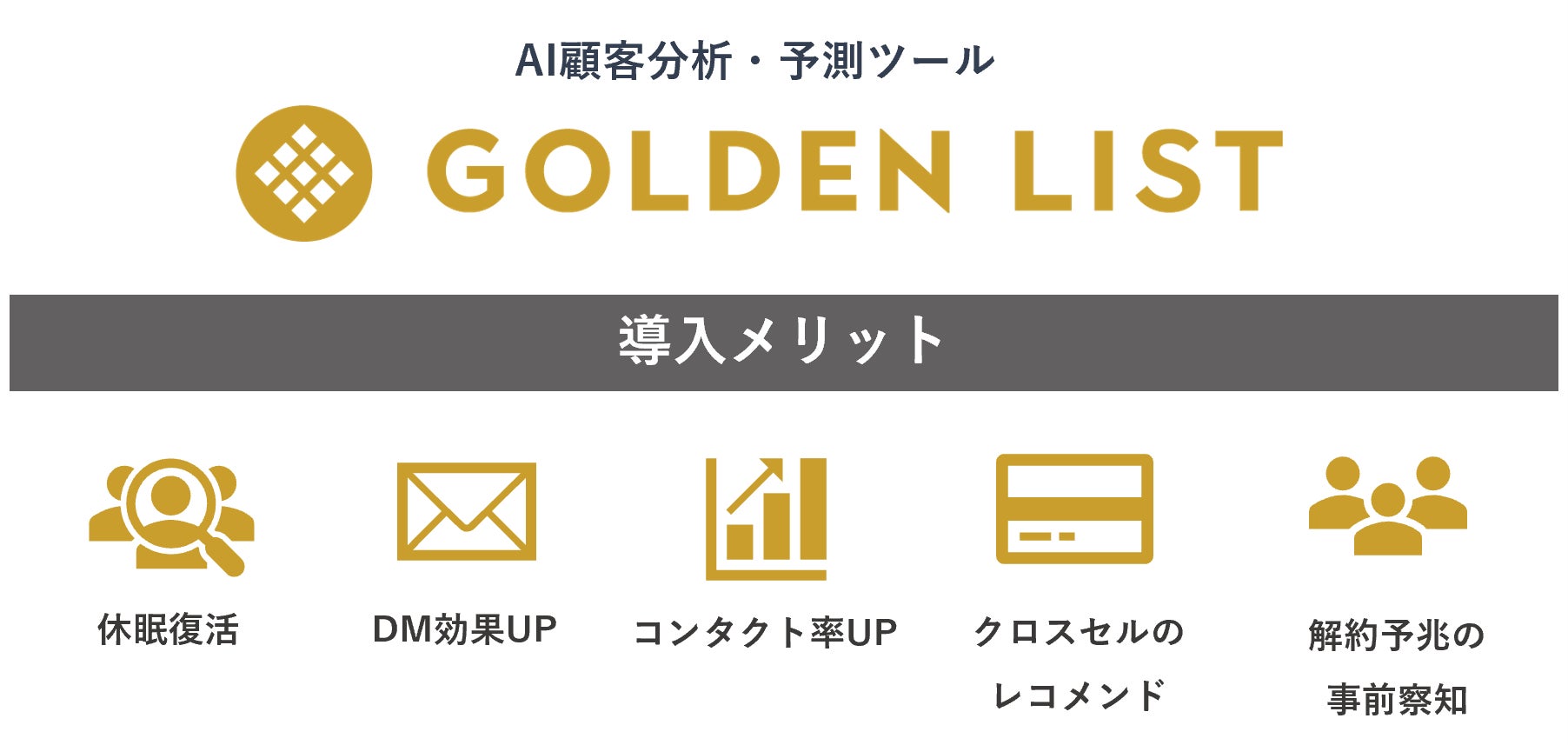 AI顧客分析・予測ツール「GOLDEN LIST」は、企業が保有する顧客データや購買データ等を活用し、成約見込みの高い消費者リストを作成する当社独自の統計解析技術を使用したデータマイニングツールです。ダイレクトメール送付やアウトバウンドコールにおける費用対効果の向上のほか、休眠顧客の復活や解約予兆の事前察知等、様々な局面で効果を発揮します。導入実績としては、地方銀行におけるカードローン利用者へのダイレクトメールへの活用、健康食品サプリメント会社における休眠顧客の復活アプローチへの活用、製薬会社における顧客の解約予兆の察知への活用等、大手企業を中心に100社以上の導入解析実績があります。