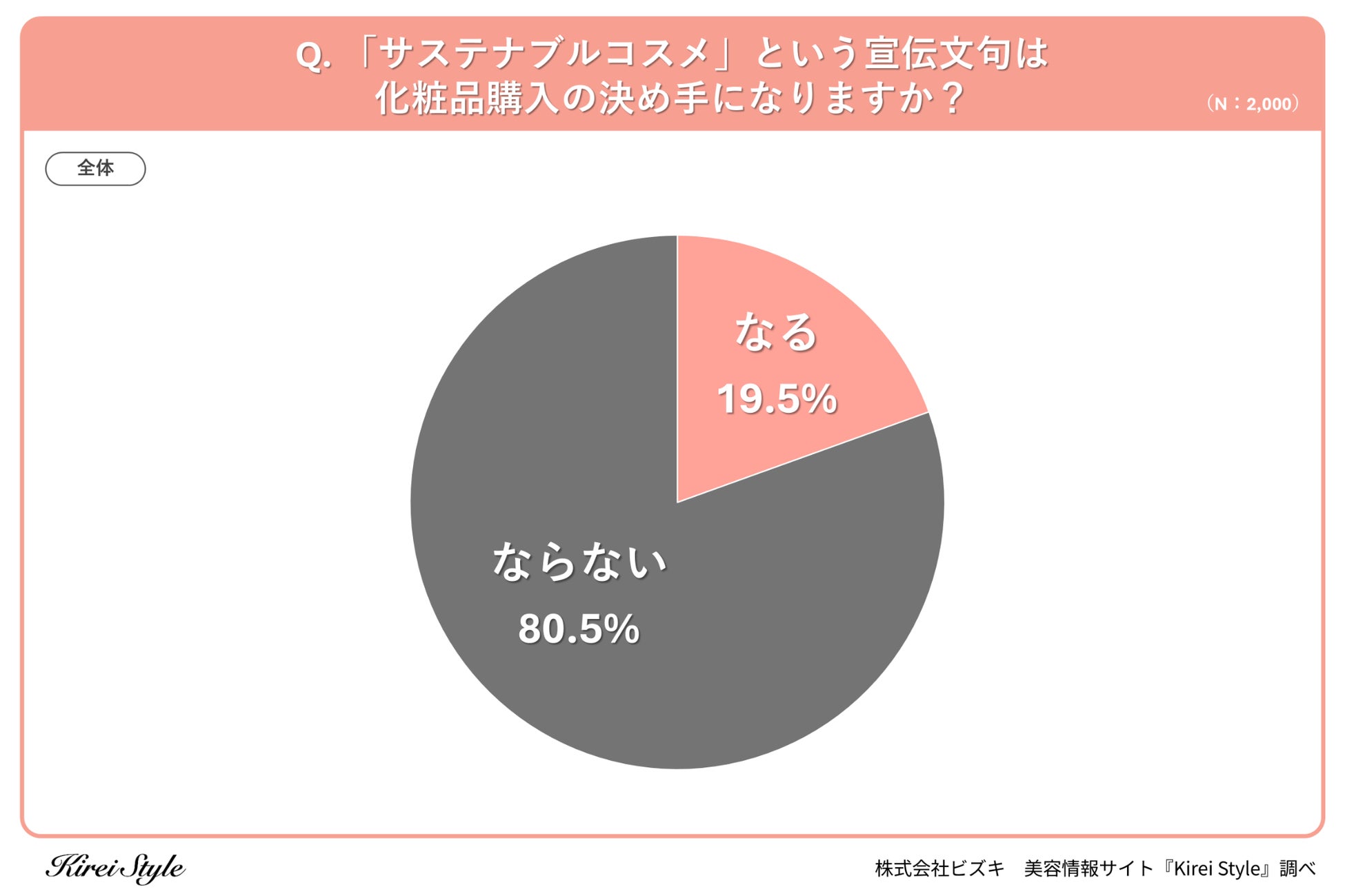全国の20代~50代の女性2,000人を対象に、『「サステナブルコスメ」という宣伝文句は化粧品購入の決め手になりますか?』というアンケートを実施したところ、「なる」という方が19.5%、「ならない」という方が80.5%という結果になりました。