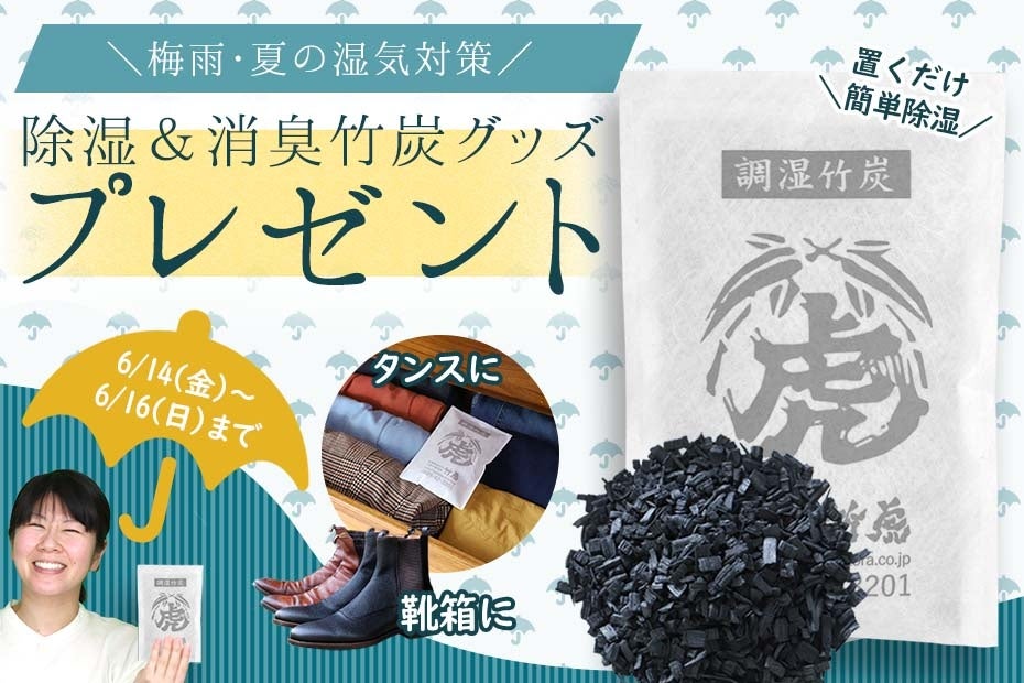 創業明治27年(1894年)より竹材・竹製品製造卸業として皆様にご愛顧いただいている竹材専業メーカーである、虎斑竹専門店 竹虎(運営:株式会社山岸竹材店)は、お客様への感謝の気持ちを込めた調湿竹炭パックプレゼントキャンペーンを開催中です。2024年6月14日(金)から6月16日(日)までの期間中に商品代金合計税込み3,300円以上お買い上げの方全員に、湿気や消臭対策に最適な調湿竹炭パック(小)を1個プレゼントいたします!