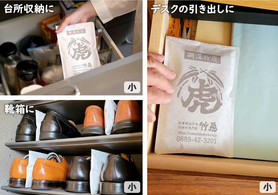 また、竹炭の強力なニオイ吸着力は靴箱や衣装ケースなどの消臭にも効果的であり、湿気を吸着してくれるので結露の防止にもおすすめです。