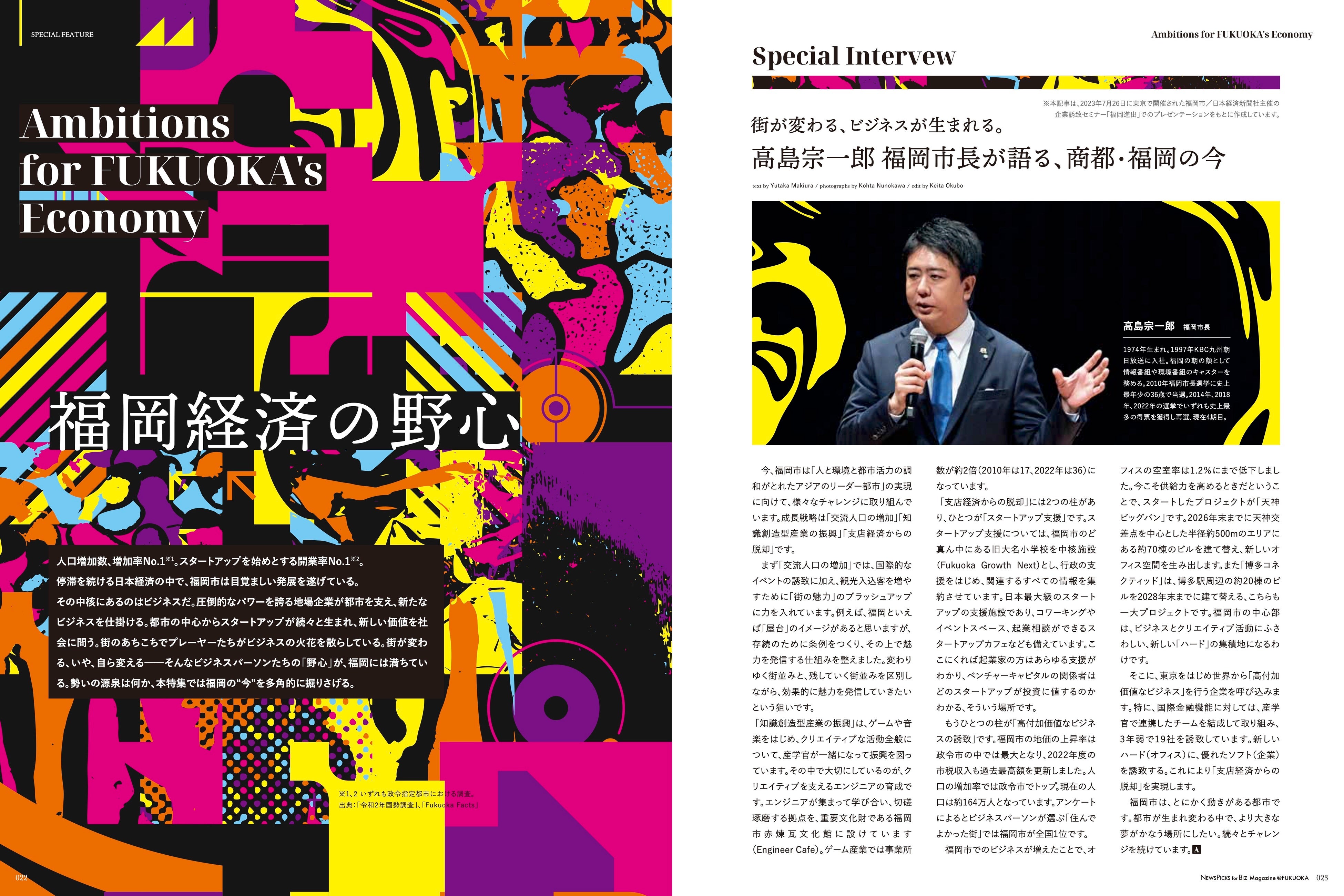 福岡経済を牽引するリーダーたちのストーリーから、大規模開発によって変わるビジネスエリアの最新動向、福岡でスタートアップが育つ理由など、福岡経済の今と未来を、さまざまな視点で掘り下げる。