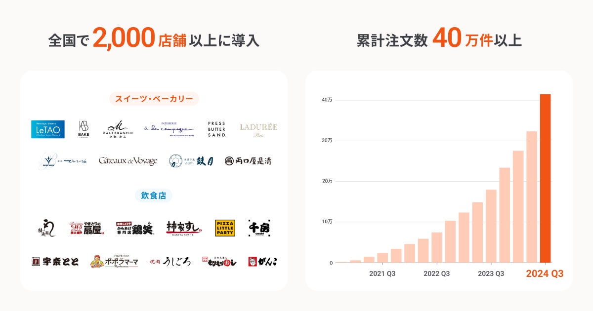 現在全国2,000店舗以上で導入されており、これまでの累計注文回数は40万件を超えております。(2024年9月時点)