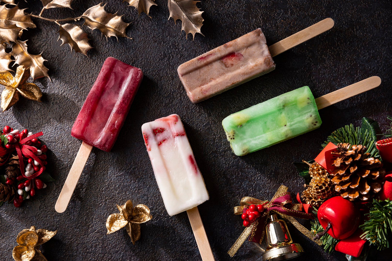 フルーツがたっぷり入ったホテルメイドのアイスキャンディー。いちごヨーグルト、アップルレモネード、チョコレート、ノンアルコール赤ワインの4種類をご用意。