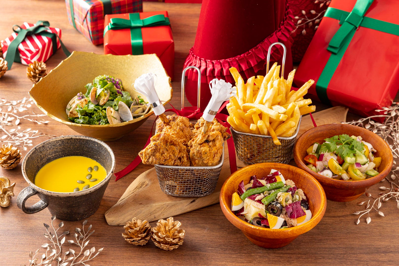 クリーミーパンプキンスープ、ヒルトン名古屋クリスマスフライドチキン「ナゴチキ」、フライドポテト、パスタヴォンゴレベルデ、烏賊と蛸のセビーチェ、サラダニソワーズ、ガーデンサラダ&ドレッシングの7種類をご用意。