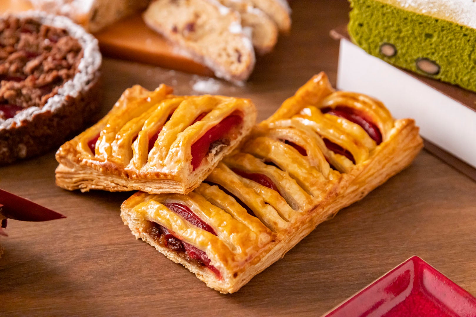 サクサクのパイ生地でピスタチオ風味のバタークリームをサンド。野生チェリーのシロップ漬けのアマレナチェリーをアクセントに。