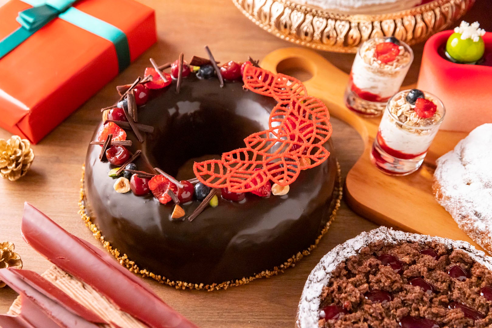 ビターチョコレートを使用した生地にオレンジカットやセミドライイチジクを加えリッチな味わいに焼き上げ、 クリスマスリース風に仕上げました。