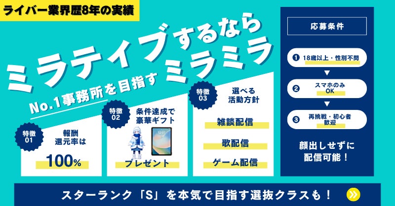 「ミラティブするならミラミラ」Mirrativパートナー事務所「ミラミラ」を設立!No.1事務所を共に目指すライバーを募集
