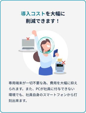 顔パス勤怠の利用には、従来使用されているタイムカード機などの専用機器やアプリのダウンロードといった作業は一切必要ありません。お手持ちのPCや自身のスマホで始められるため、導入費用やランニングコストを抑えつつ手間なくスムーズに運用を開始できます。
