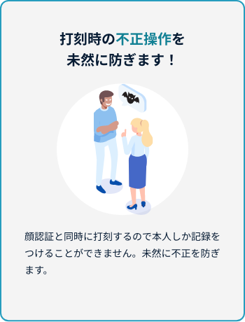 打刻時に顔認証することで、本人以外の不正打刻を防止します。手書きやタイムカード機による打刻とは異なり、社員間で代わりに打刻を押す「友情押し」などの不正を予防することができます。