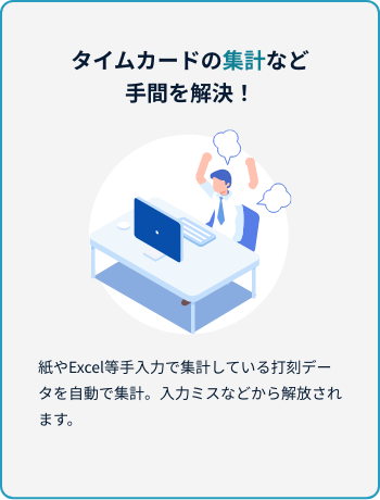 これまでの勤怠システムでは、社員同士での不正打刻の心配がありました。また、手書きやタイムカード機で記録をつけた後、Excelへ入力や集計する手間が発生していました。