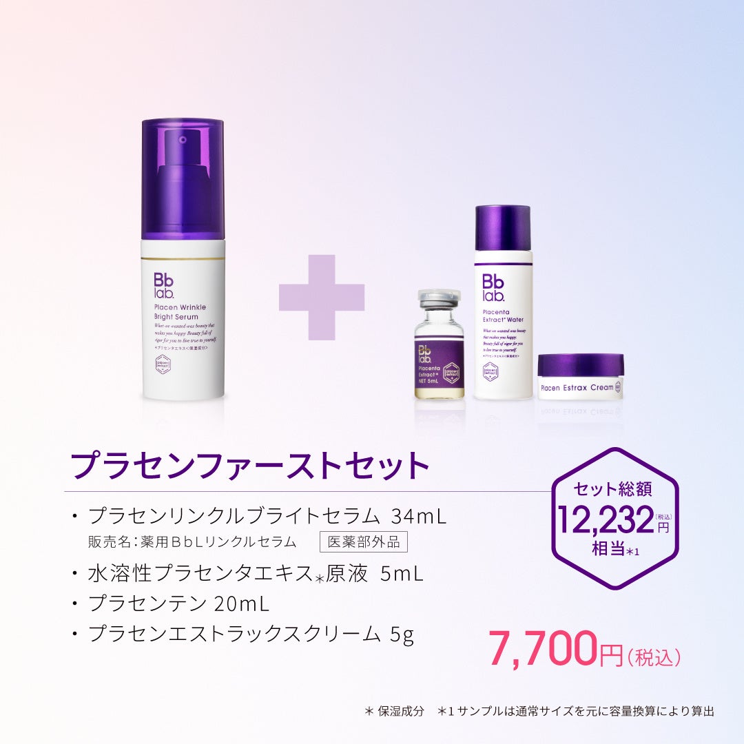 有効成分ナイアシンアミドとグリチルリチン酸ジカリウムを配合した「プラセンリンクルブライトセラム」にミニサイズがセットになった「プラセンファーストセット」。