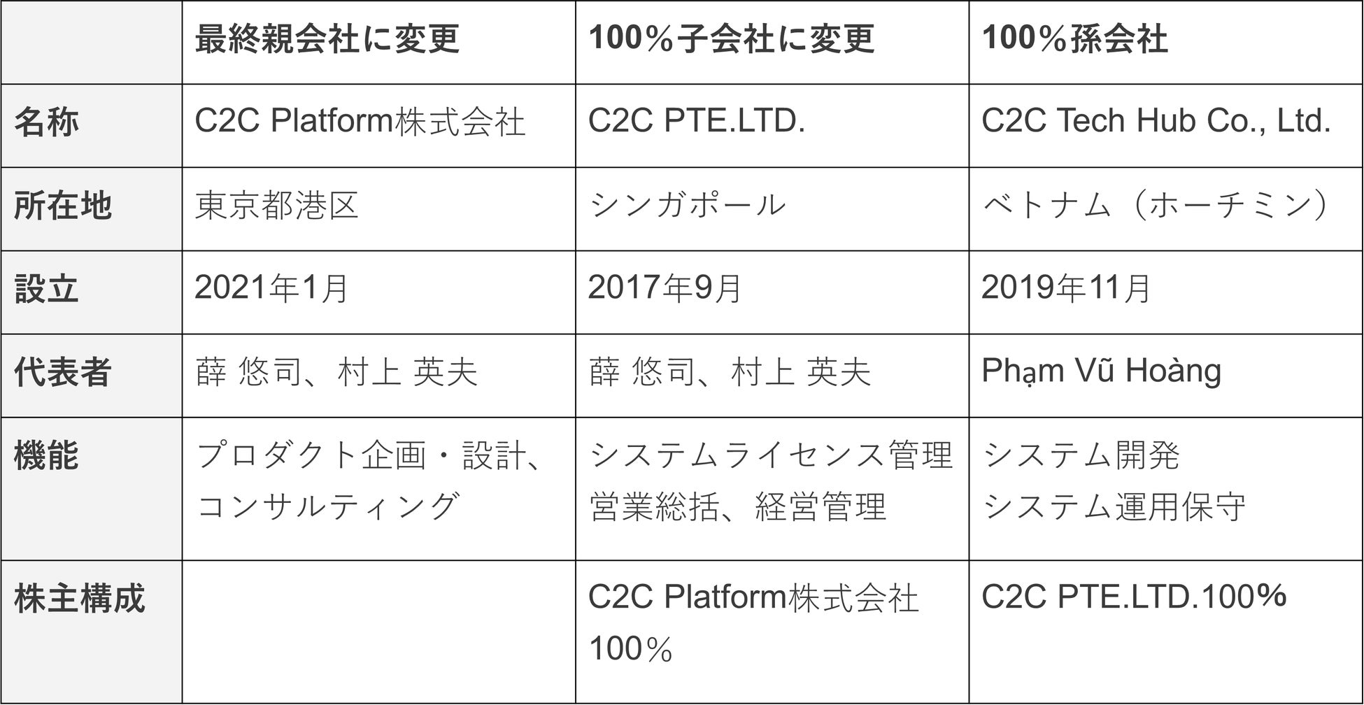 日本の証券市場への上場を目指すにあたり、過去の他社事例によると、上場対象となる最終親会社が外国会社であることにより当該会社への出資やその他の各側面において様々な制約が見受けられたため、この度2022年6月に、日本法人であるC2C Platform株式会社を親会社とする組織再編を実施いたしました。